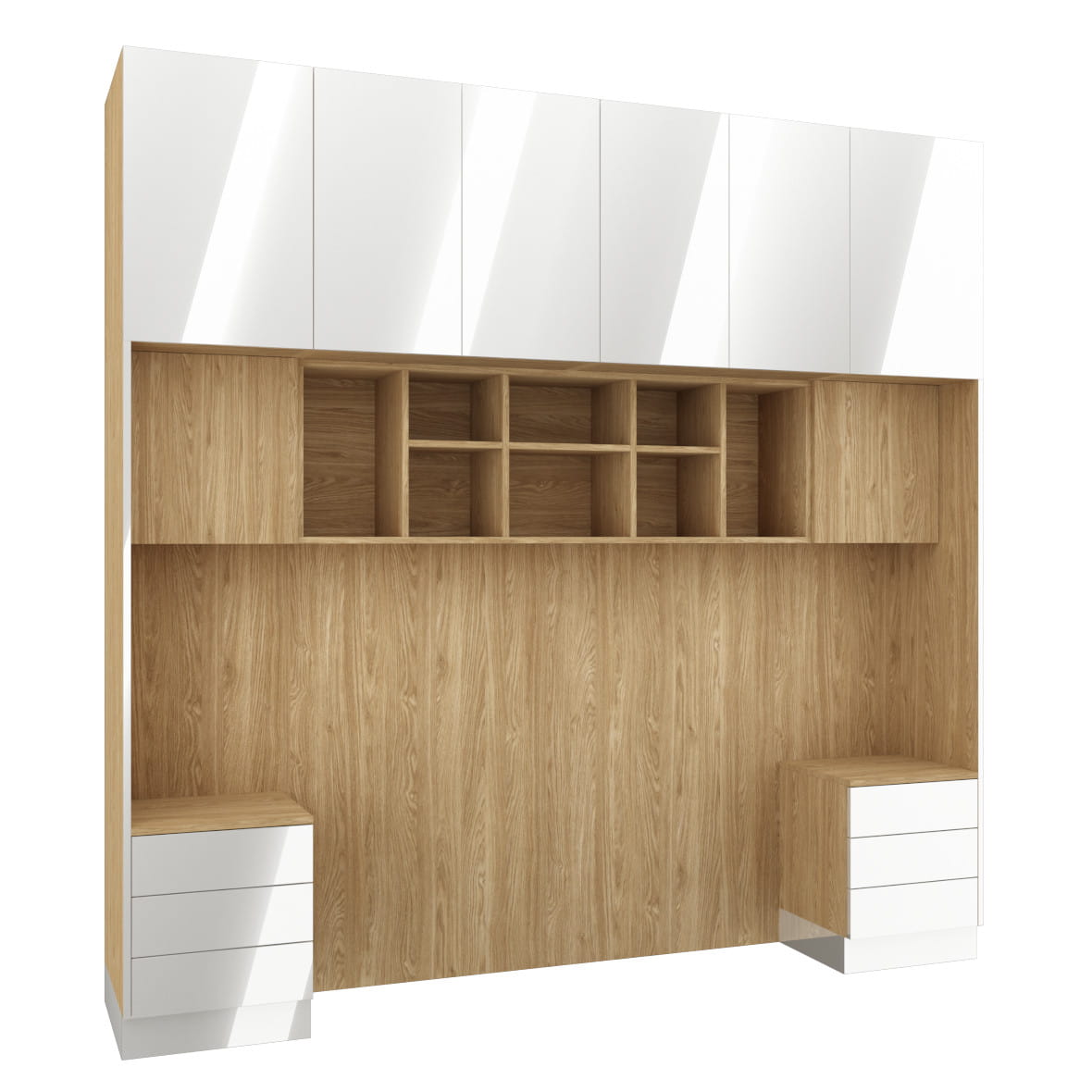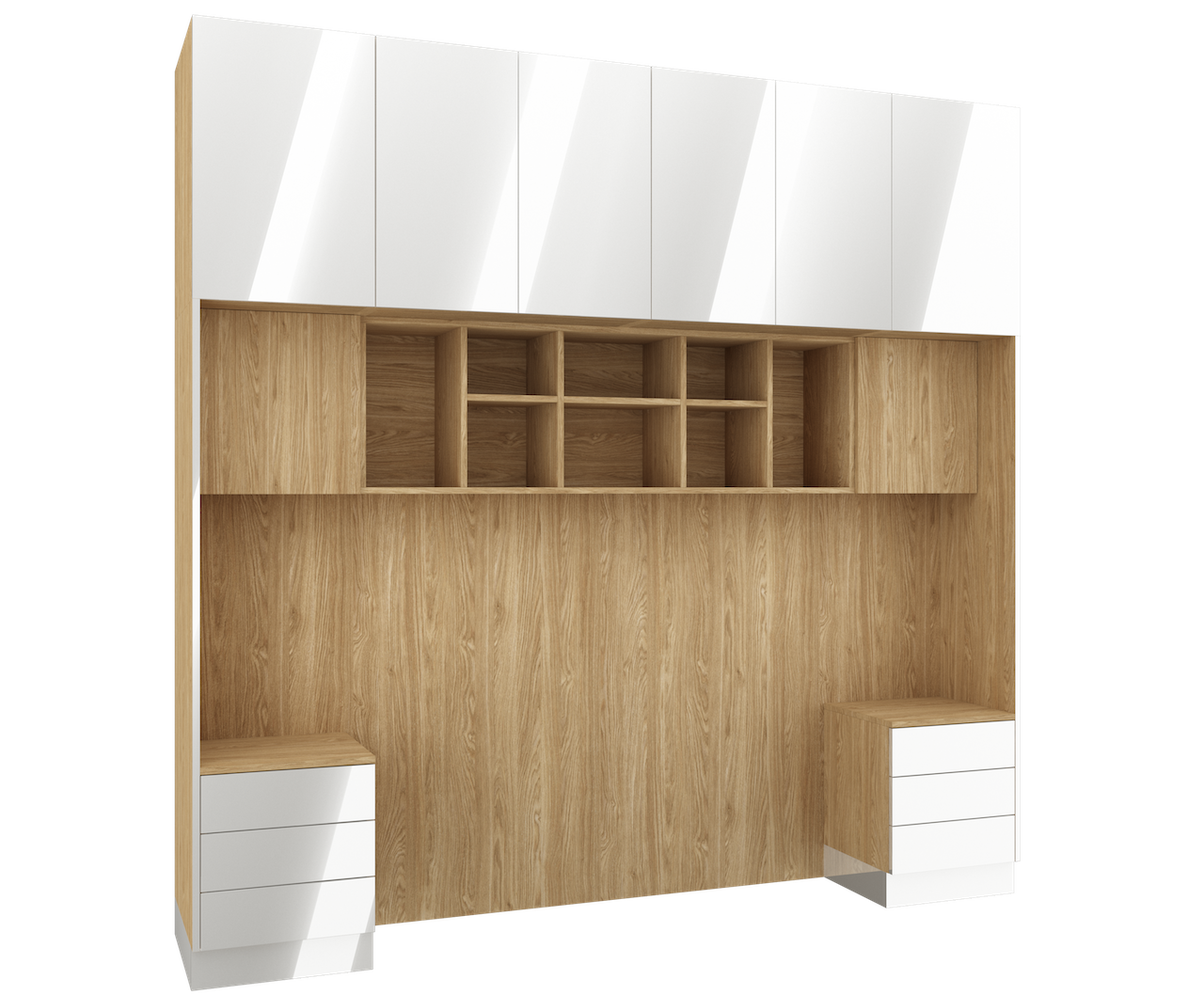 Baza do łóżka składająca się z zabudowanej wnęki na łóżko ze stolikami nocnymi z szufladami oraz z górnych szafek z półkami (oświetlenie led pod regałem poziomym). Korpus zabudowy oraz półki wykonane z płyty meblowej w kolorze olejowanego dębu, o wyraźnym usłojeniu i przyjemnym, bardzo naturalnym dotyku. Fronty z płyty w kolorze biały mat. Rozwiązanie idealne do małych sypialni.