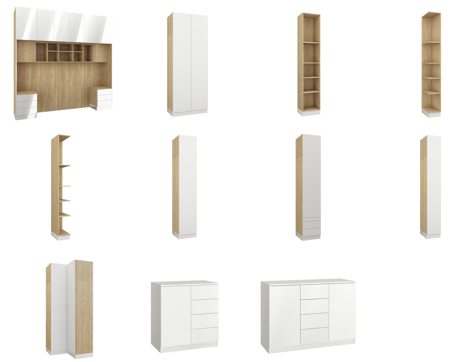 Praktyczne i pojemne meble pomieszczą wszystkie niezbędne przedmioty i pomogą utrzymać porządek. Klient może wybierać spośród następujących elementów: