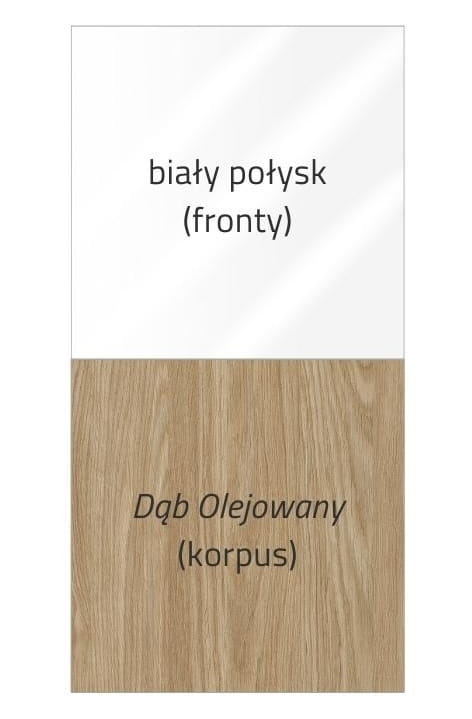 Wariant połysk:Kolor korpusu/wnętrza: Dąb olejowany / Kolor frontów: biały połysk / Widoczne elementy bazy w kolorze : Dąb olejowany. Komody całe biały połysk.
