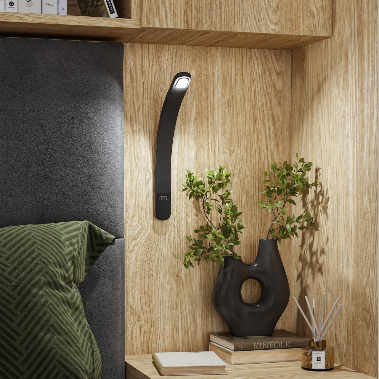 Do bazy ze stolikami polecamy bardzo wygodne lampki nocne flexi, wyginające się w różnych kierunkach, z wejściem USB. To dobre rozwiązanie do czytania i ładowania telefonu.