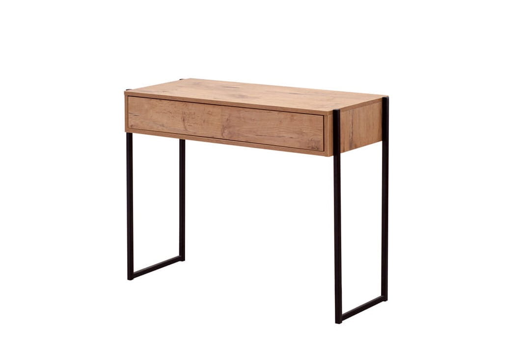 Minimalistyczna konsola w loftowym stylu. Wykonana z płyty meblowej Dąb Lancelot i czarnego metalu. Praktyczna szuflada pod blatem zamykana systemem push & pull.