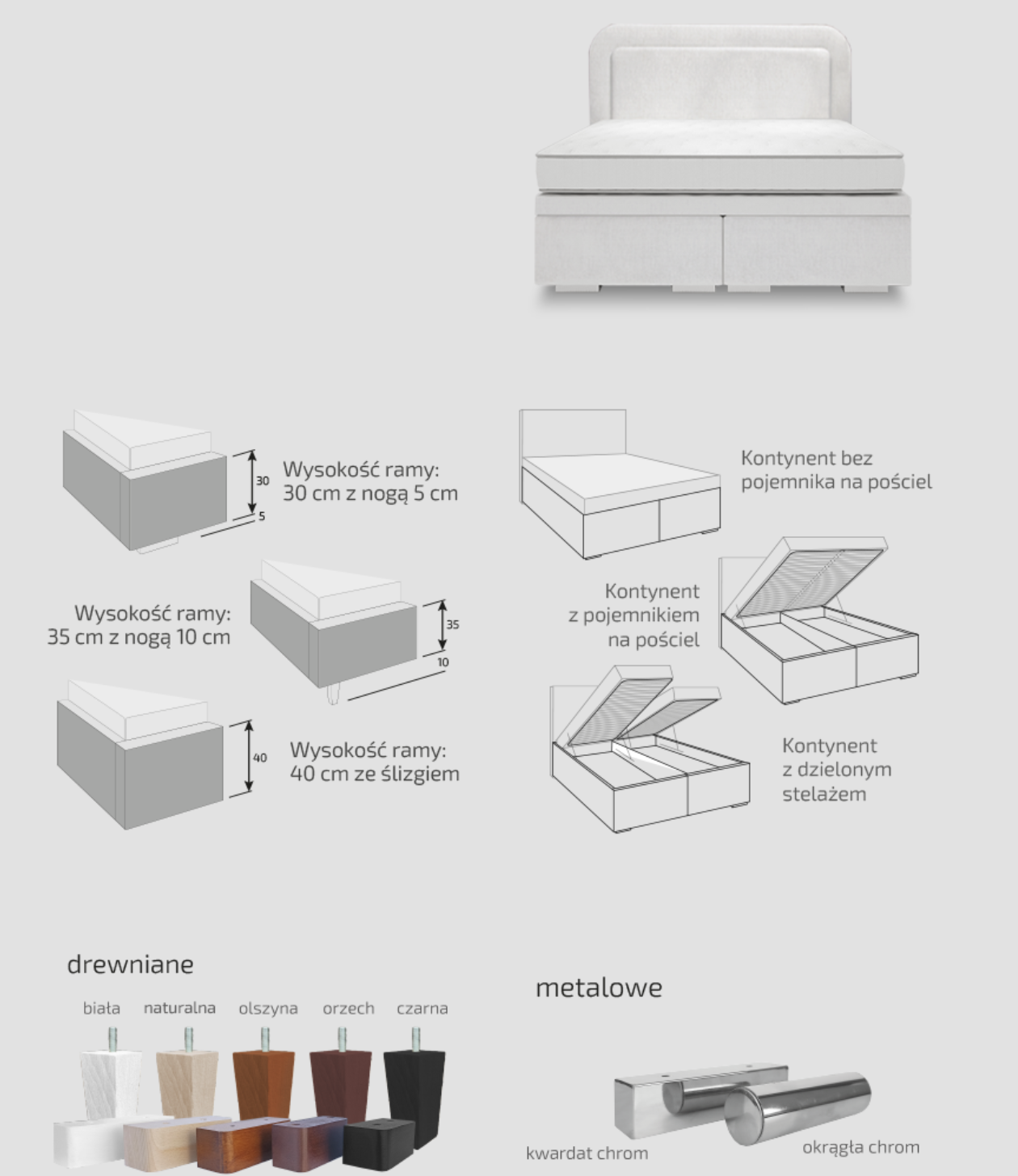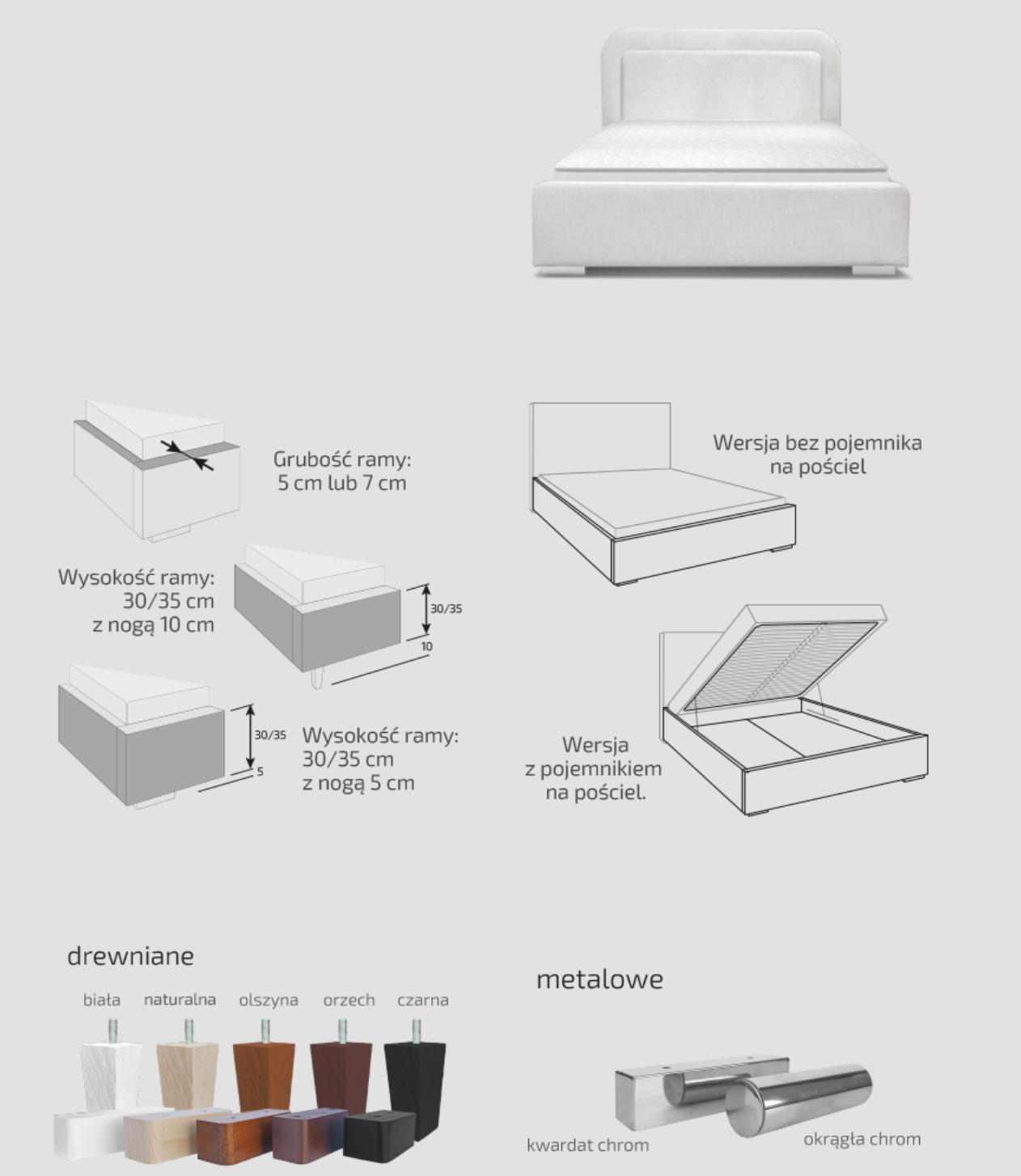 Modele z ramą light to łóżka z wąską 5 cm ramą o wys. 27 cm, na nogach metalowych o wys. 13 cm z opcją bez pojemnika lub z pojemnikiem na pościel.