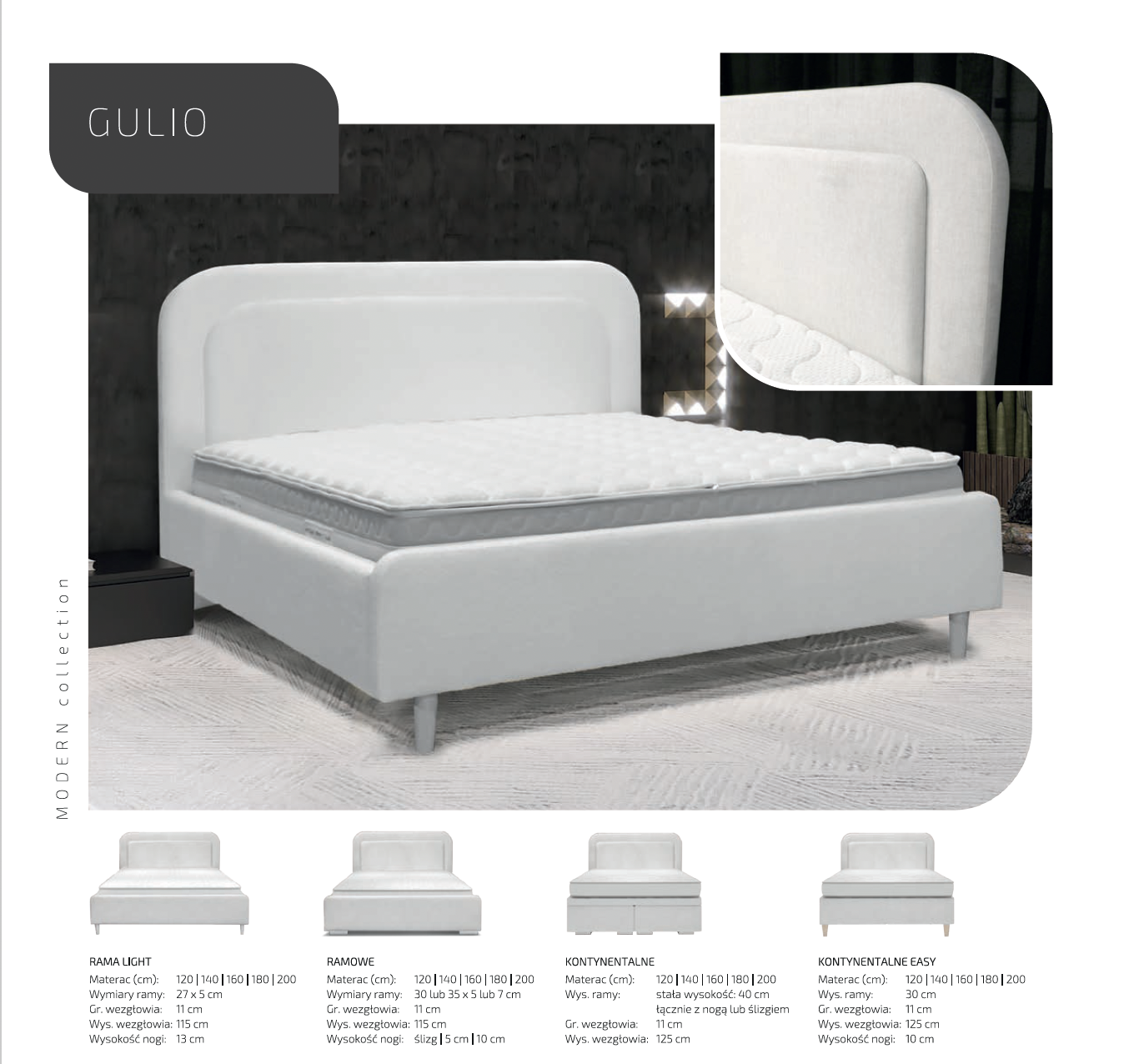 Producent tworząc łóżko Gulio chciał aby nowoczesny wystrój sypialni nie kojarzył się tylko z prostą formą, ale przede wszystkim pięknym łóżkiem, wygodą korzystania oraz ponadczasowym charakterem.