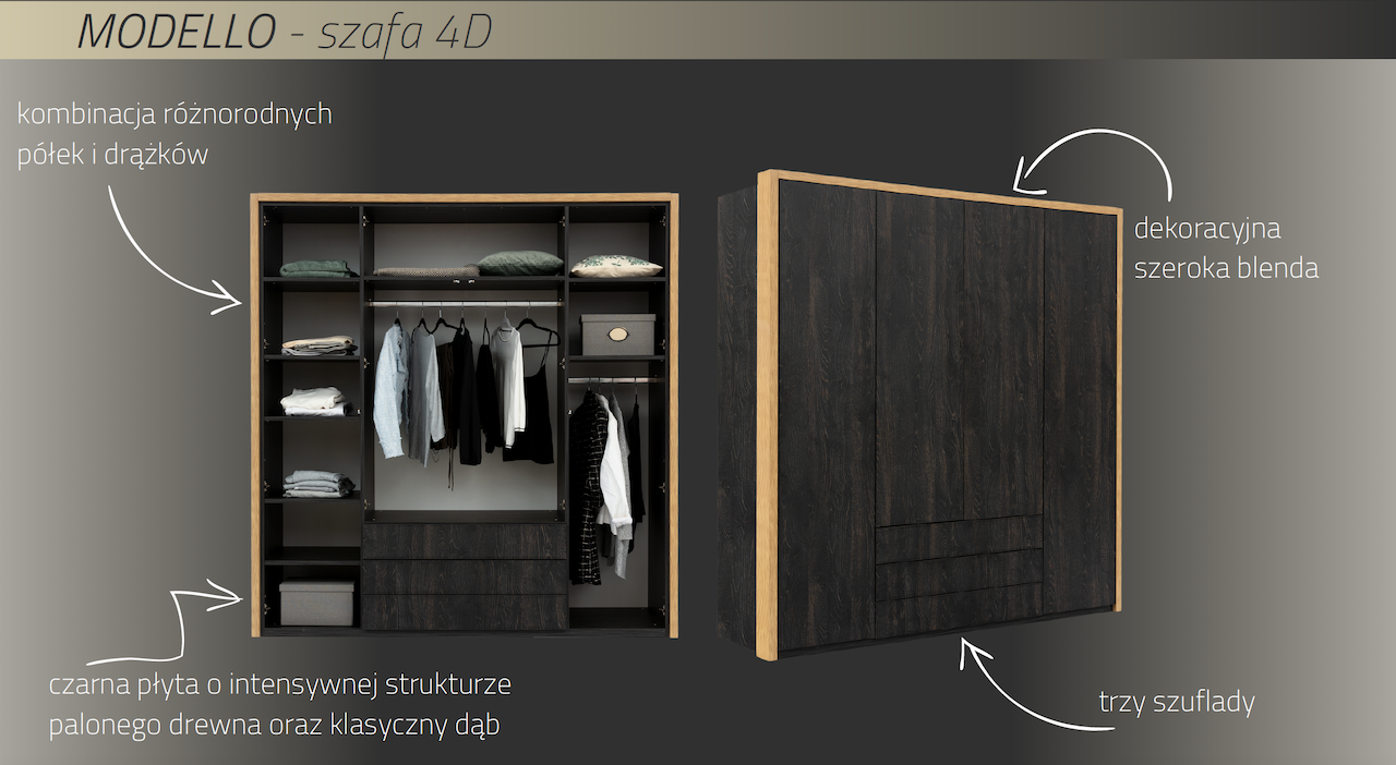 - Szafa 4D3S: szer. 198 cm / wys. 206 cm / gł. 60 cm