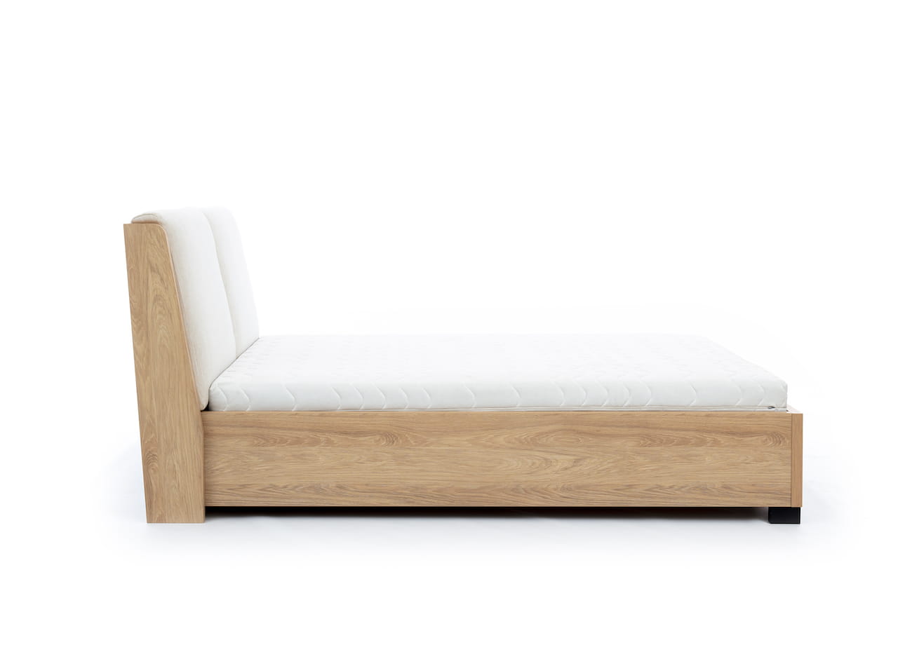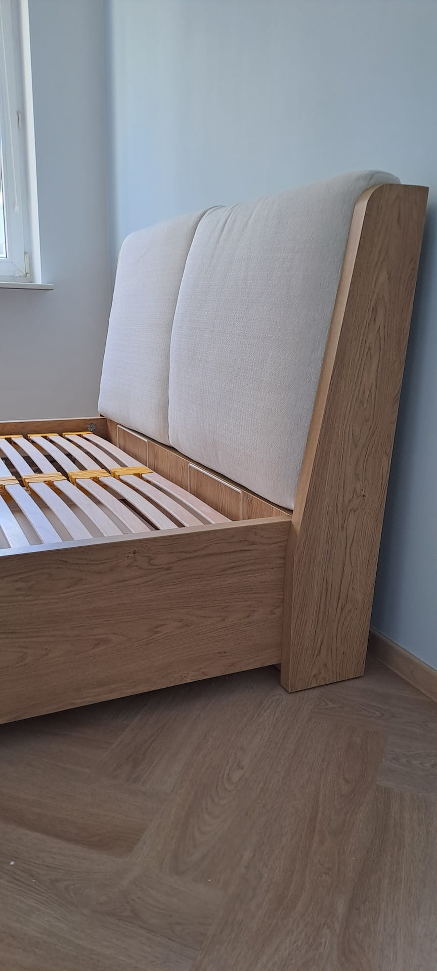 Designerski łóżko do sypialni z grubej płytyDąb Baltic Dune (Pfleiderer). Łóżko z miękkimi poduchami na odchylonym wezgłowiu, w tkaninie Positano o strukturze delikatnej plecionki z kolekcji Davisa.