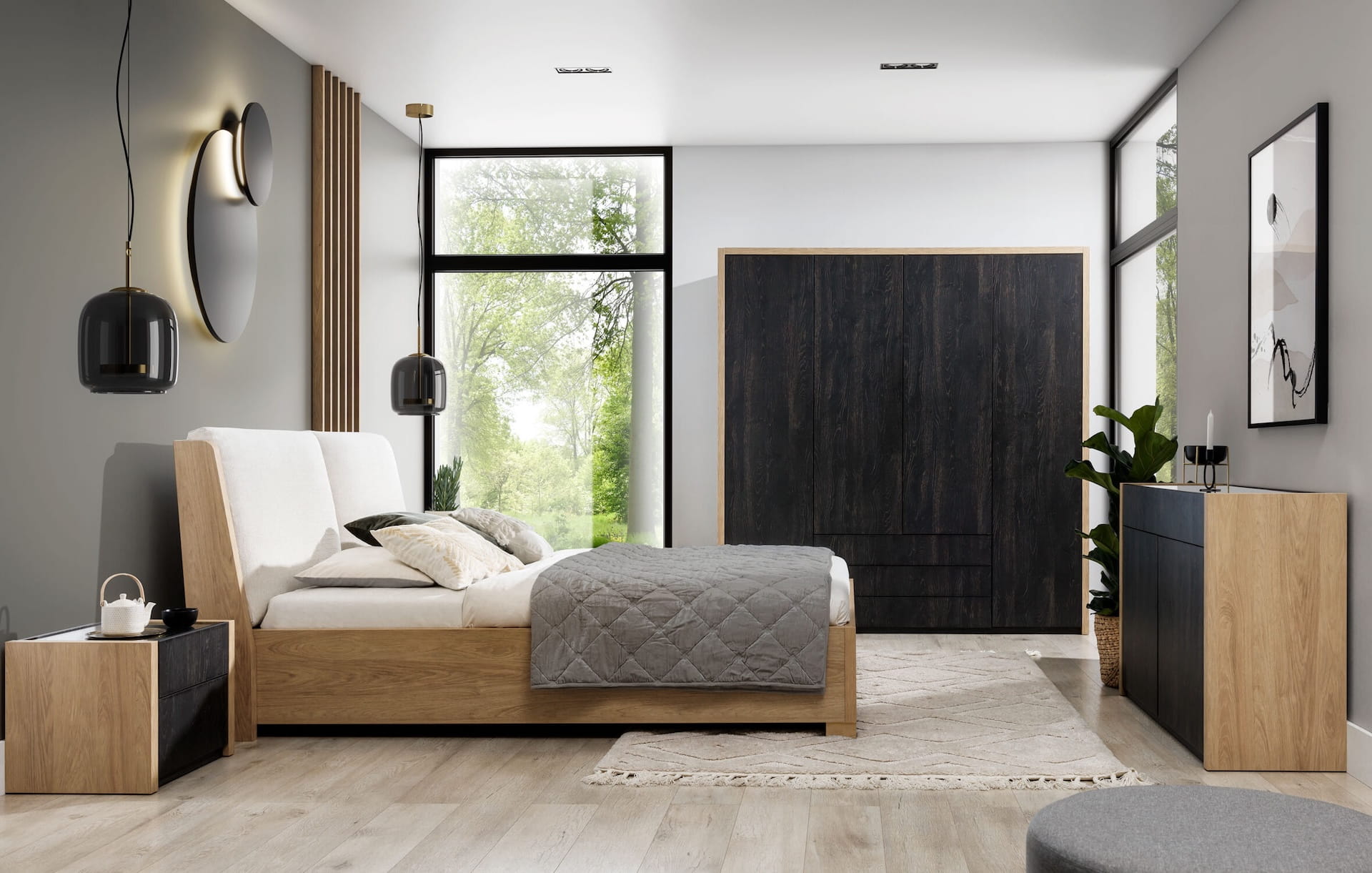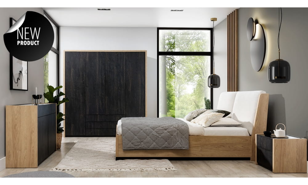 Model z kolekcji mebli do sypialni wykonanych z połączenia pięknej płyty meblowej w dekorze dąb Hikora oraz bardzo oryginalnej płyty Flamed Wood, przypominającej rysunek palonego drewna. Złote żyłki na czarnym usłojeniu pięknie komponują się z miodową barwą dębu Hikora. W skład kolekcji wchodzi bardzo wygodne łóżko z grubej płyty meblowej (38 mm) z wygodnymi, miękkimi poduchami w trzech odcieniach do wyboru (beż, krem, jasny brąz), uzupełniają je praktyczne szafki nocne z szufladami i szklanym blatem. Duża, czterodrzwiowa szafa z szufladami zewnętrznymi i komoda ze szklanym blatem stanowią doskonałe uzupełnienie zestawu.
