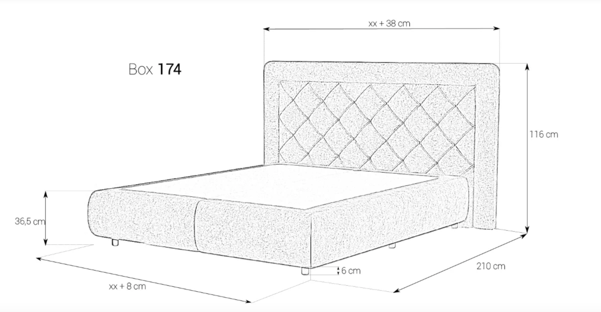Podstawa: łóżko BOX 174 w wybranym obiciu na ramie drewnianej posiadające wkład ze sprężyn bonelowych. W skład Boxa wchodzi podstawa, zagłówek oraz nogi.