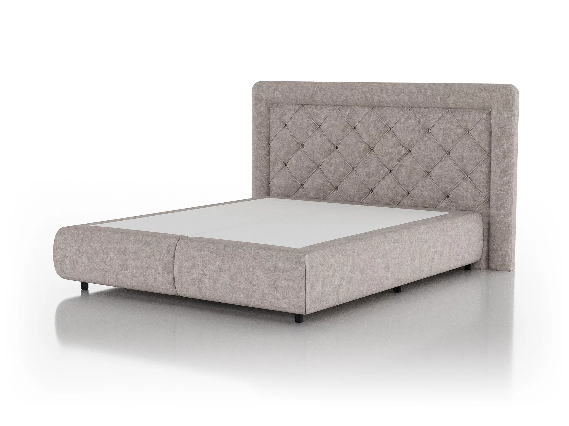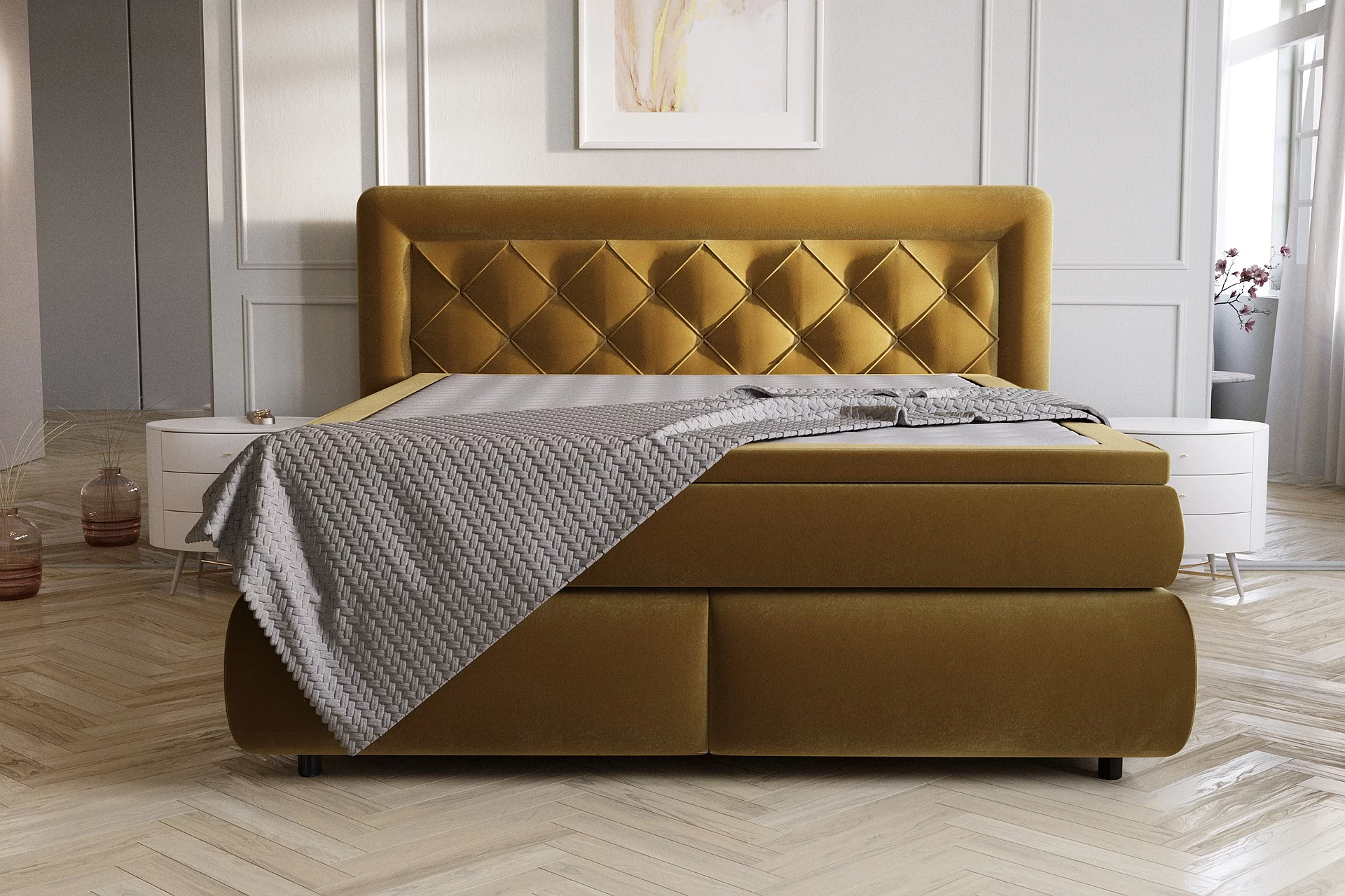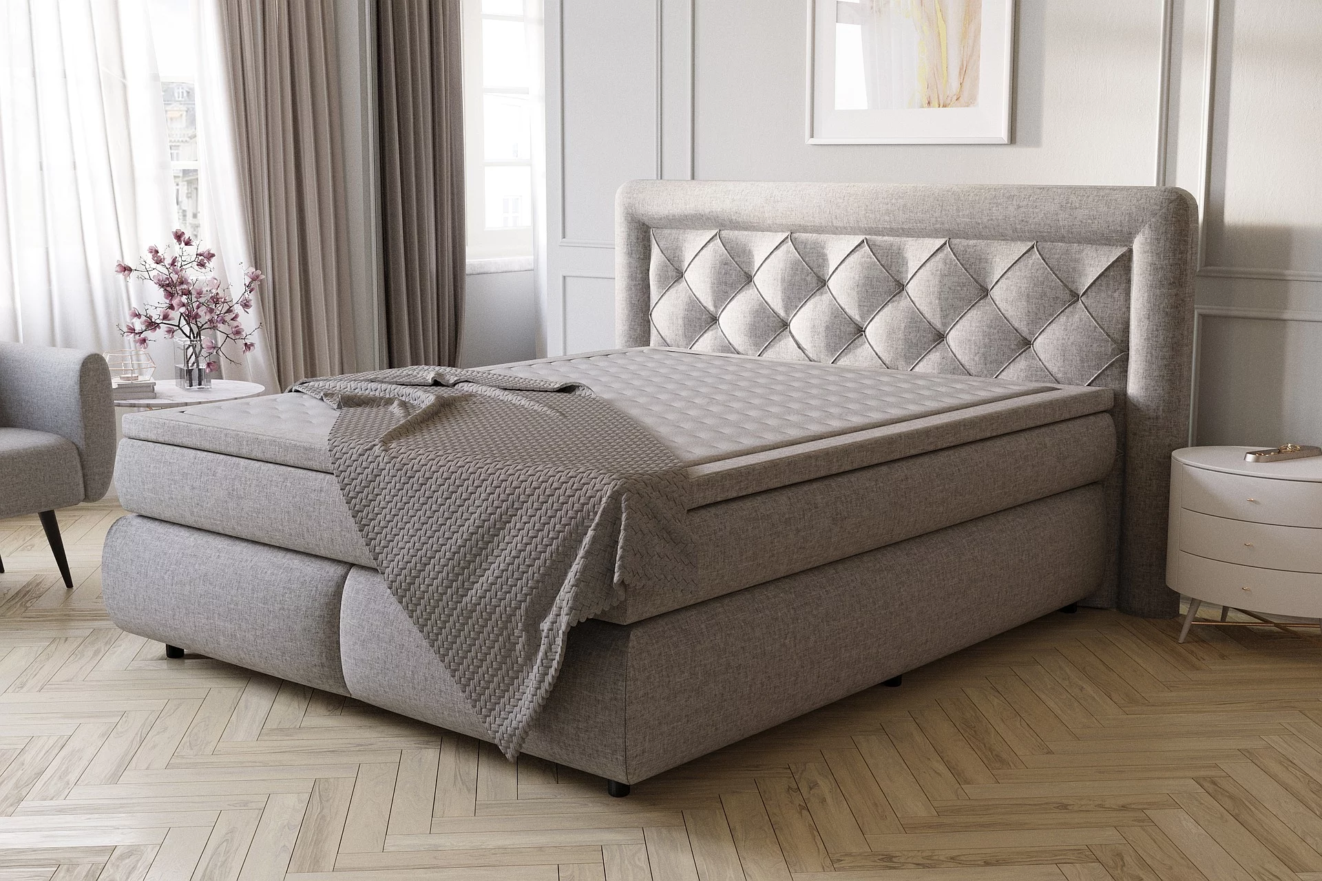 Ten wytworny box składa się z korpusu łóżka z nogami i zagłówka. To klasyczne, komfortowe, eleganckie łóżko kontynentalne w obiciu z tkaniny w bogatej kolorystyce, na ramie drewnianej, posiadające wkład ze sprężyn bonelowych. Materac i przekładka w adekwatnej tkaninie. Łóżko charakteryzuje szerokie wezgłowie. Znakomicie się prezentuje w każdym typie sypialni.