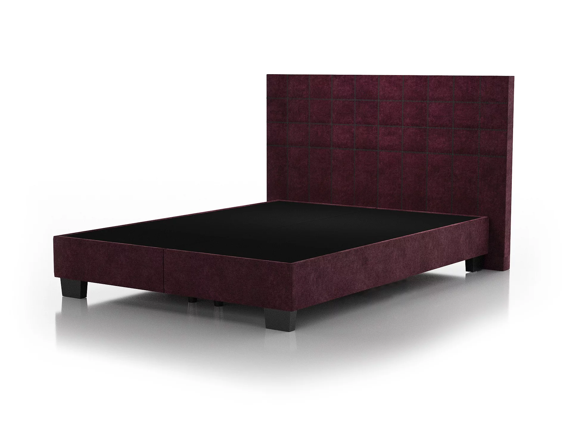 Ten minimalistyczny box składa się z korpusu łóżka z nogami i zagłówka. To klasyczne łóżko kontynentalne w obiciu z tkaniny w bogatej kolorystyce, na ramie z płyty i na stelażu z listew prostych. Materac i przekładka w adekwatnej tkaninie. Łóżko charakteryzuje geometryczne wezgłowie. Znakomicie się prezentuje w nowoczesnych, subtelnych sypialniach.