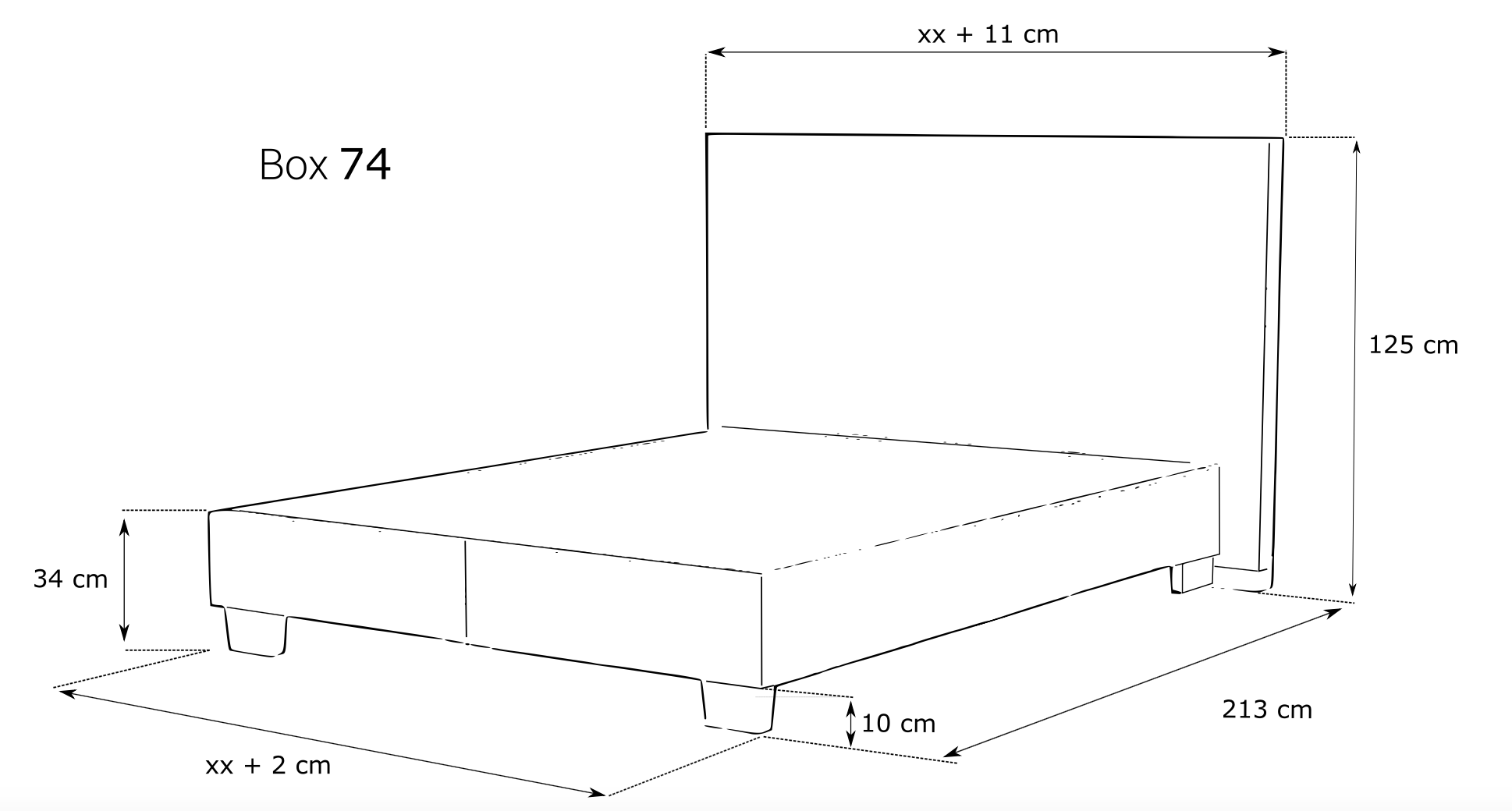 Podstawa: łóżko BOX 74 w wybranej tkaninie, wykonane z płyty, stelaż z listew prostych. W skład Boxa wchodzi podstawa, zagłówek oraz nogi.