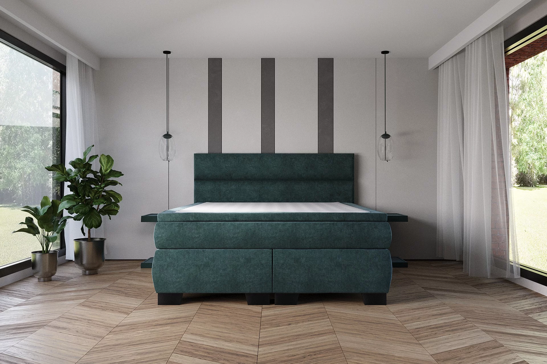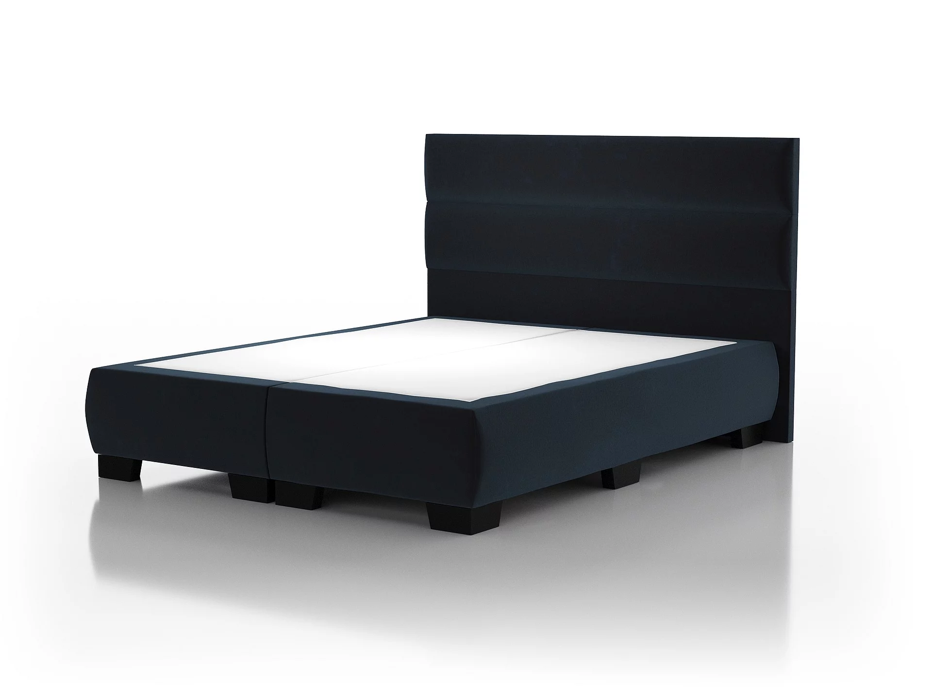 Box składa się z korpusu łóżka z nogami i zagłówka. To klasyczne, komfortowe łóżko kontynentalne w obiciu z tkaniny w bogatej kolorystyce, na ramie drewnianej, posiadające wkład ze sprężyn bonelowych. Materac i przekładka w adekwatnej tkaninie. Nogi dostępne w kilku wybarwieniach. Łóżko znakomicie się prezentuje w każdym typie sypialni. Dzięki poziomym przeszyciom wezgłowia zyskuje szeroki i przestronny wygląd.