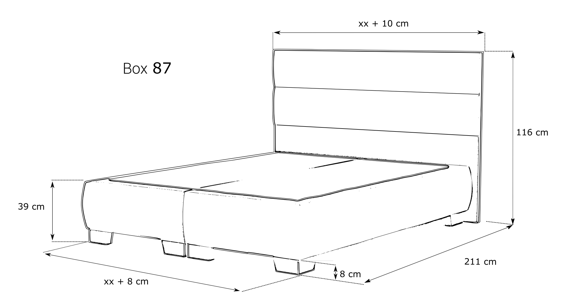 Podstawa: łóżko BOX 87 w obiciu do wyboru na ramie drewnianej, posiadające wkład ze sprężyn bonelowych. W skład Boxa wchodzi podstawa, zagłówek oraz nogi do wyboru w różnych wybarwieniach.