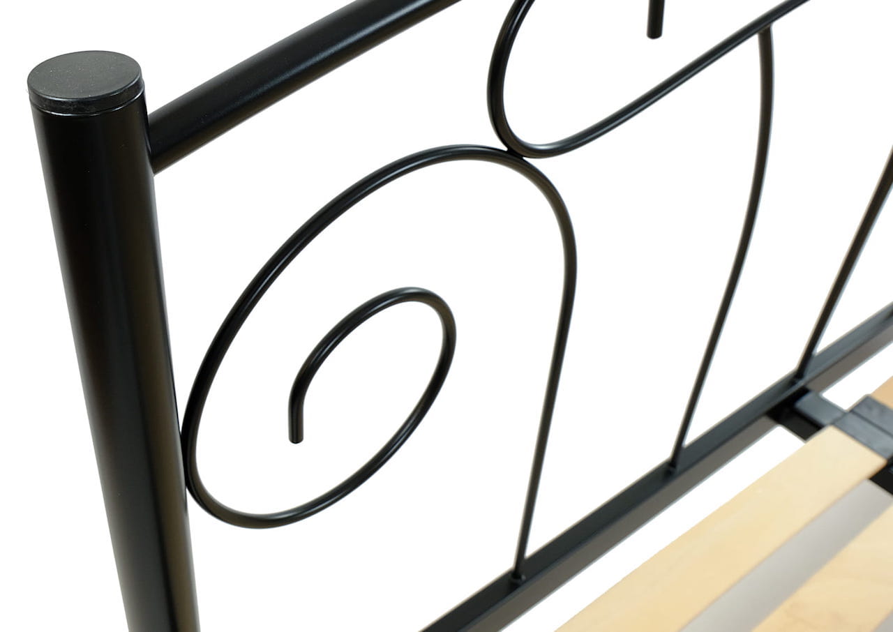 Nogi łóżka zostały wykonane z rury stalowej o średnicy 38 mm. Łuk wezgłowia – rura stalowa o średnicy 20 mm. Elementy dekoracyjne to pręt ciągniony okrągły o średnicy 8 mm. Nogi łóżka zostały zabezpieczone zaślepkami, chroniącymi przed uszkodzeniami podłoża.