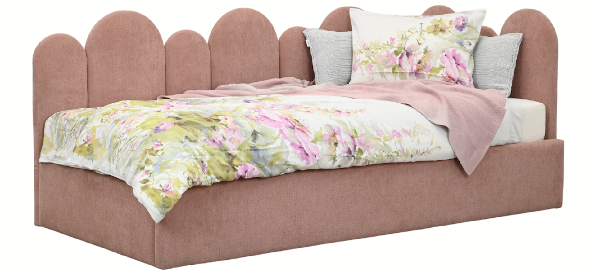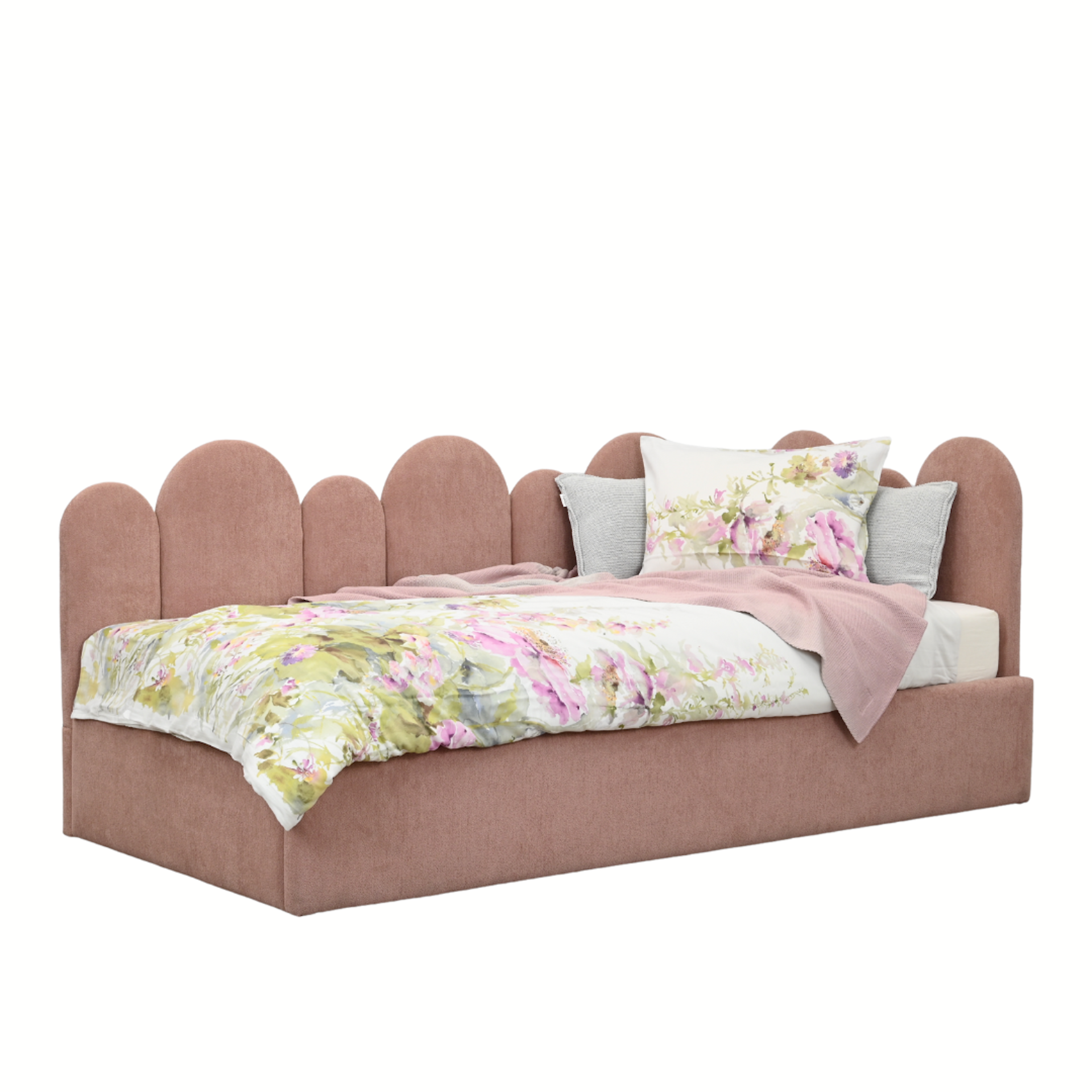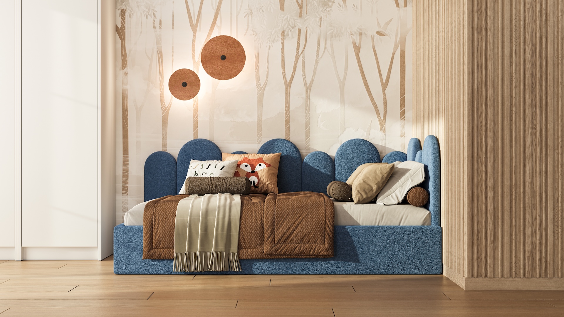 Jego charakterystycznym elementem jest narożne wezgłowie z półkolistych paneli, które tworzą falującą linię. To rozwiązanie nie tylko pięknie wygląda, ale też jest wyjątkowo praktyczne: miękkie, zaokrąglone kształty są bezpieczne w codziennym użytkowaniu i dodają wnętrzu lekkości oraz przyjaznego klimatu.
