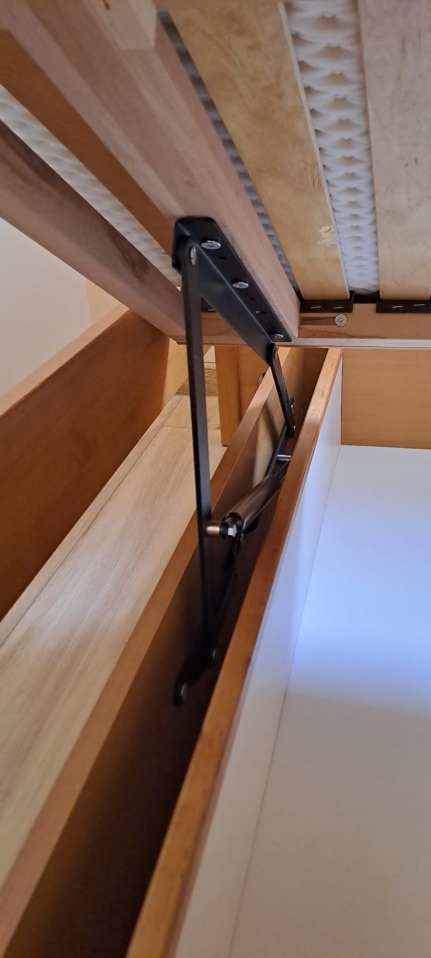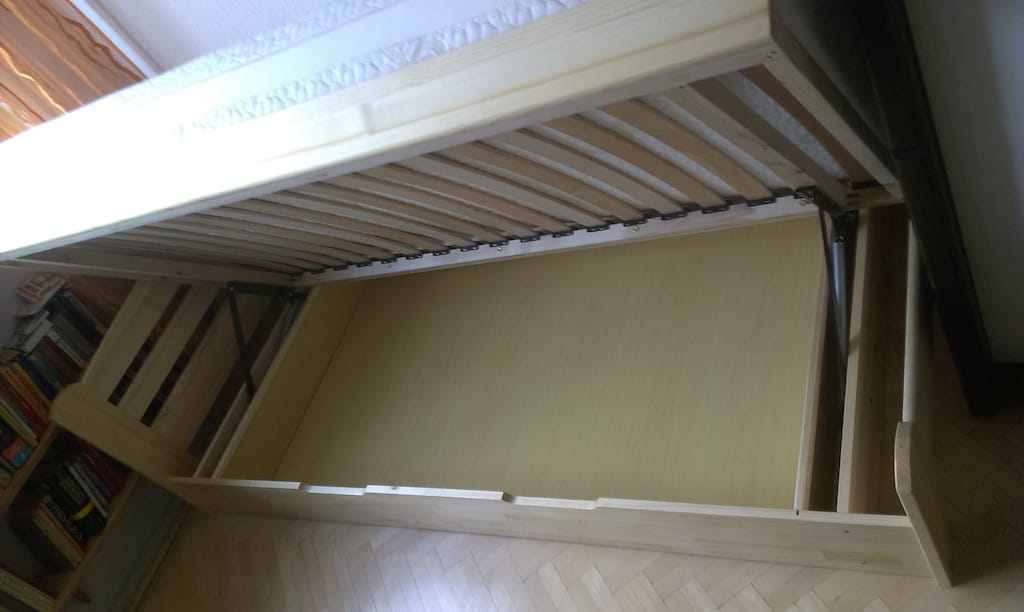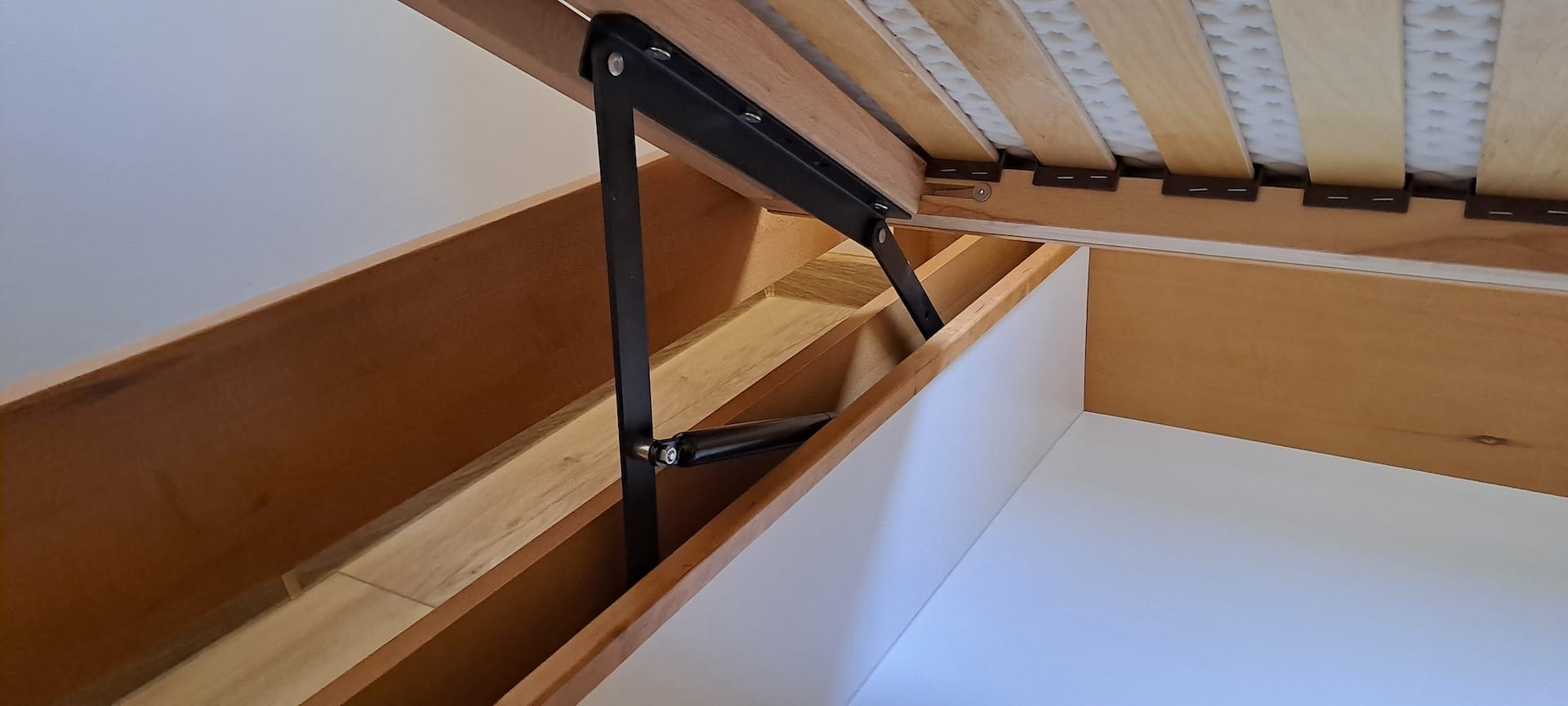 Stelaż w łóżku z pojemnikiem sprężysty,listwy bukowe klejone warstwowo,osadzone w elastycznych uchwytach na ramie stelaża.