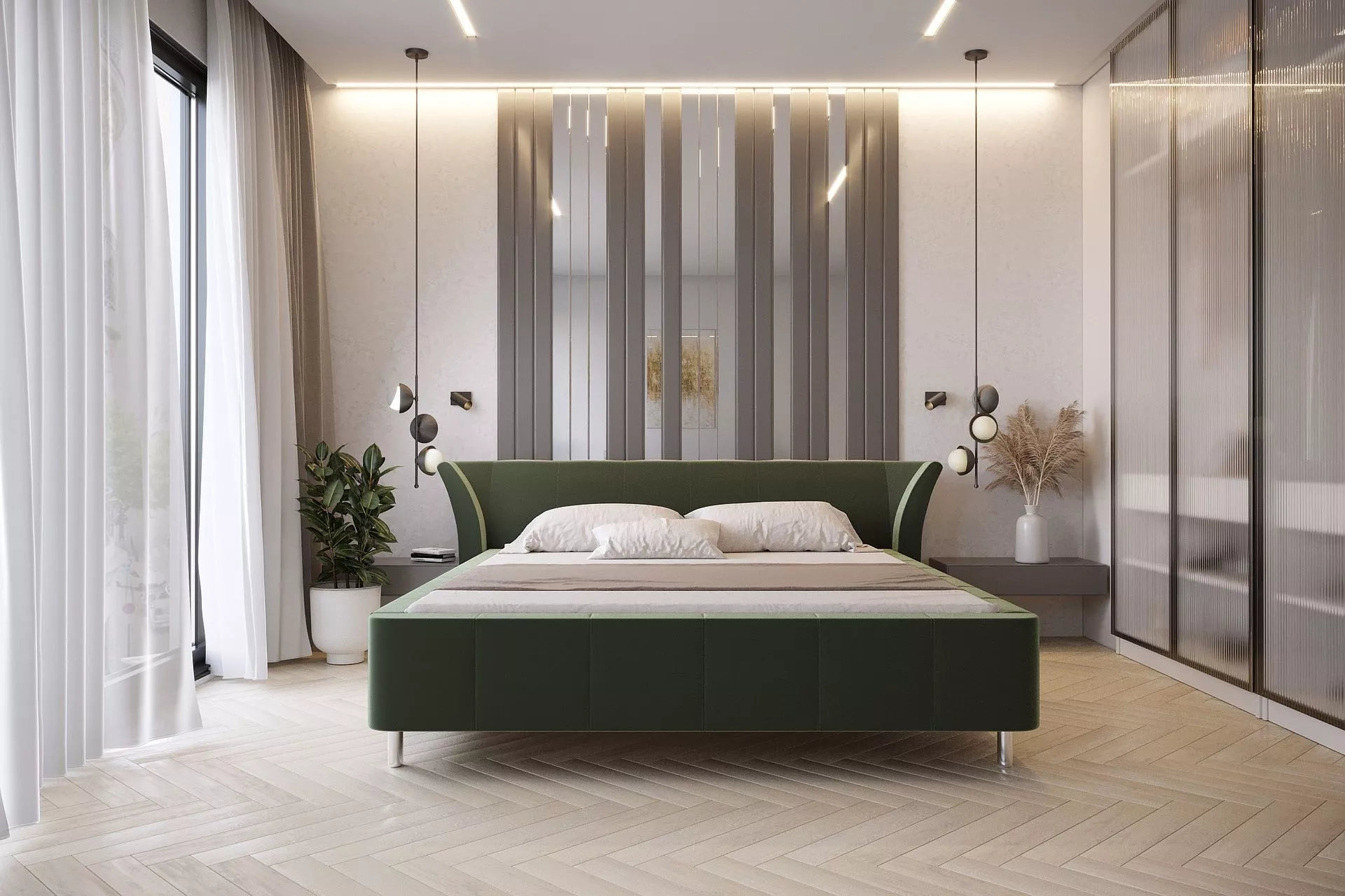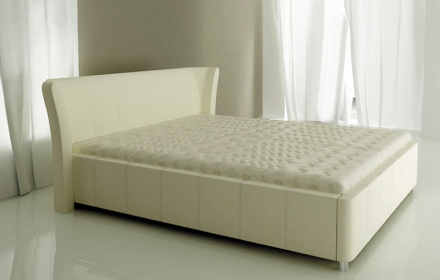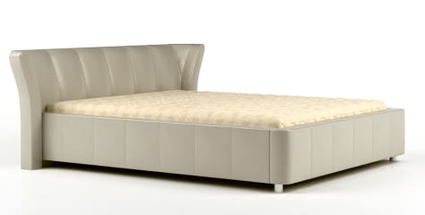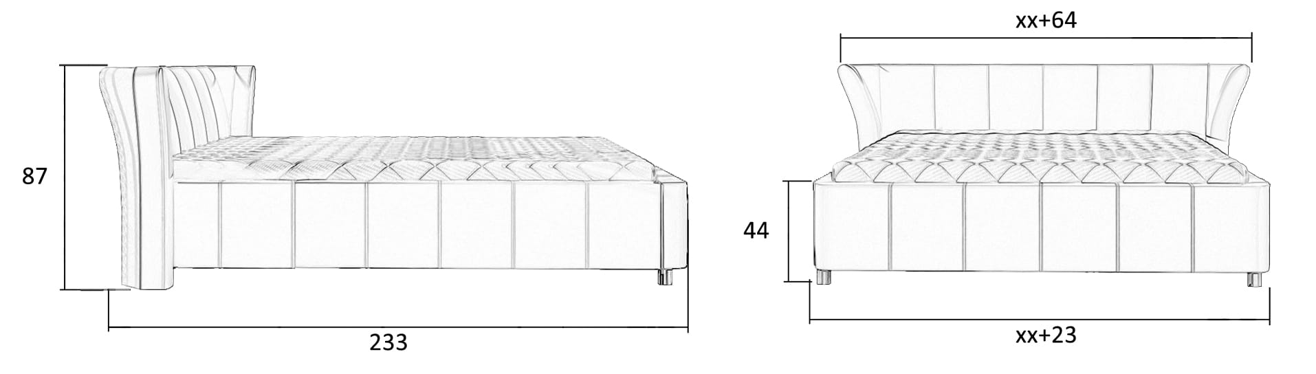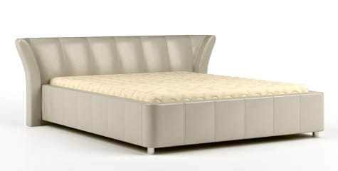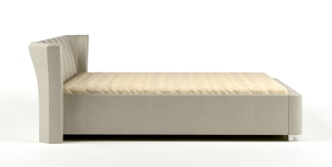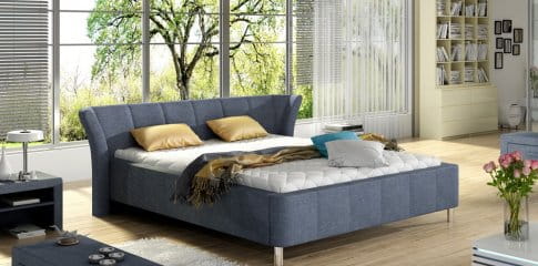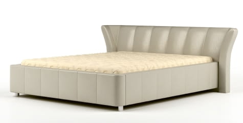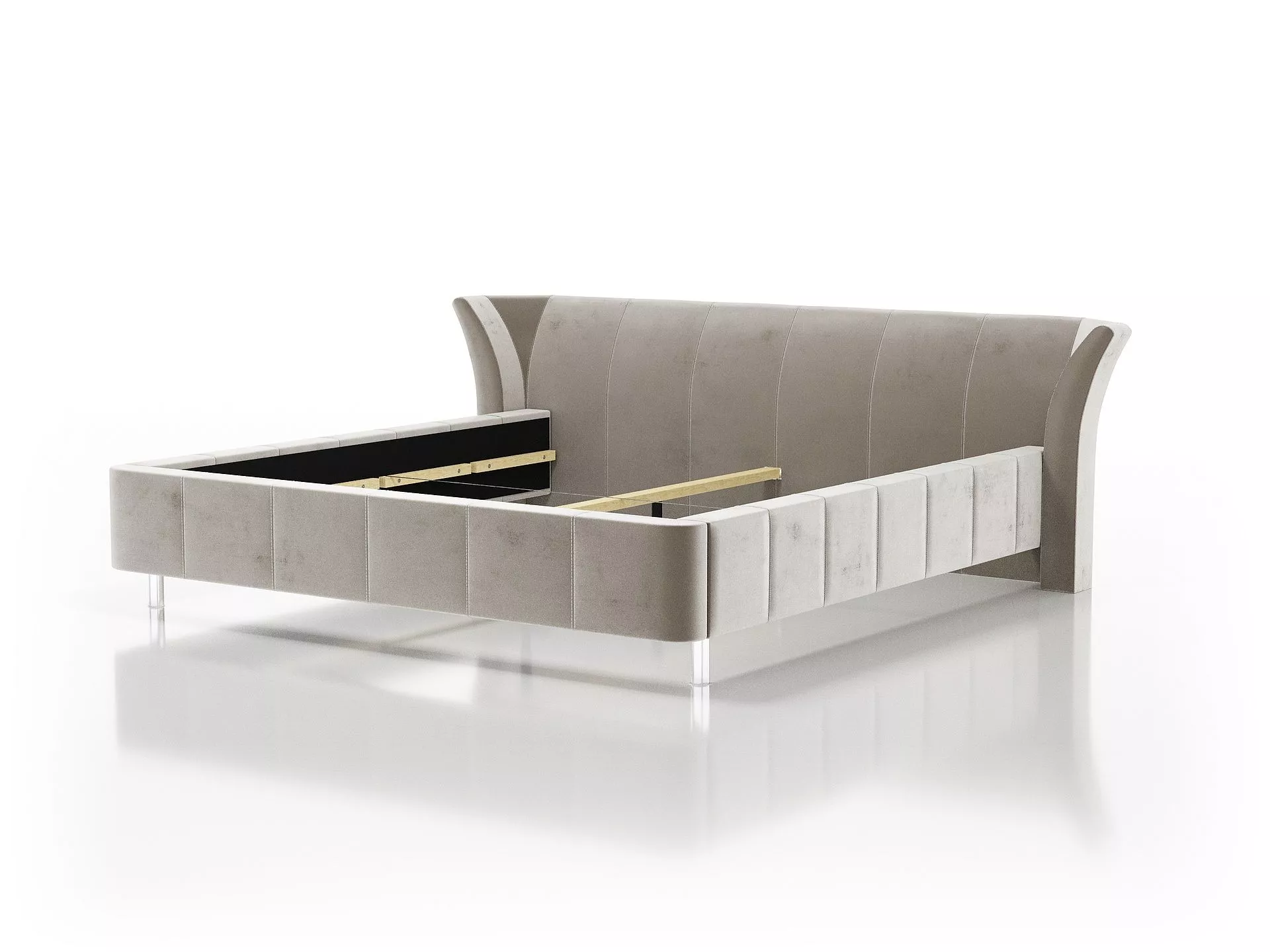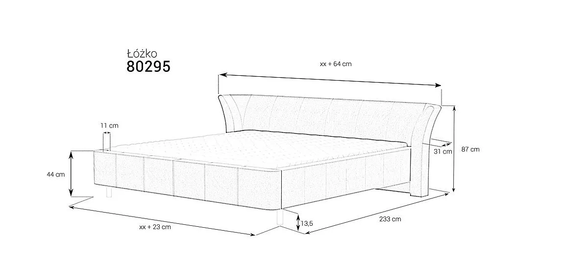 Oryginalne, tapicerowane łóżko, którego prosta rama została urozmaicona finezyjnym, wygiętym, otwierającym się ku górze zagłówkiem. Doskonale sprawdzi się zarówno w klasycznych, jak i nowoczesnych sypialniach. Idealne dla osób szukających nietypowego stylu. Uroku projektowi dodają przeszycia na ramie i zagłówku. Szyku i elegancji dodaje tapicerowany z obu stron zagłówek. Dostępne w szerokiej gamie kolorystycznej. Możliwość zastosowania pojemnika na pościel ze stelażem na ramie drewnianej lub metalowej. Poza standardowymi wymiarami, łóżko jest dostępne również w nietypowej długości i szerokości. Dla uzyskania pełnego zadowolenia klienta zalecamy odpowiedni stelaż i materac z naszej oferty.
