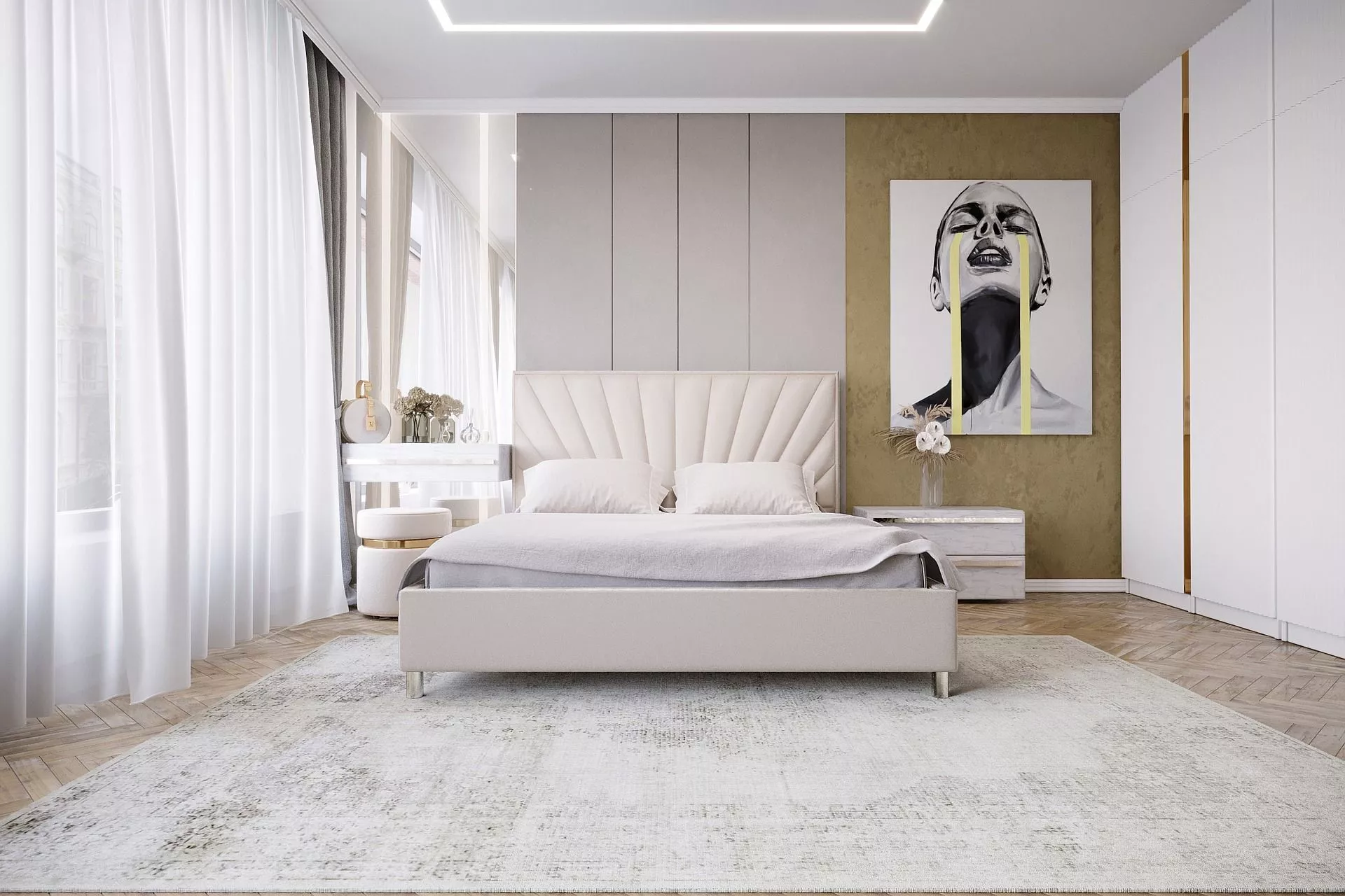 Konstrukcja z płyty na zewnątrz obita jest tkaniną meblową w szerokiej gamie kolorystycznej. Mebel stoi stabilnie na 10-cm okrągłych, chromowanych nogach. Poza standardowymi wymiarami, łóżko jest dostępne również w nietypowej długości i szerokości. Za dodatkową opłatą zagłówek można otapicerować w tylnej części. Dla uzyskania pełnego zadowolenia klienta zalecamy odpowiedni stelaż i materac z naszej oferty.
