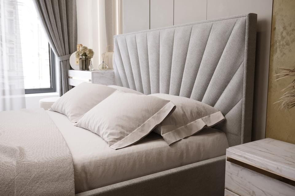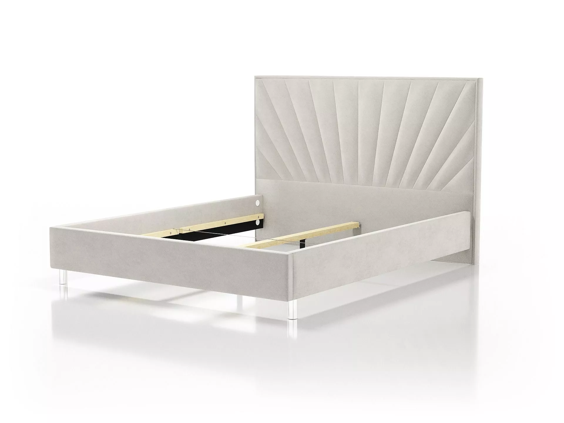 , którego prosta rama zwieńczona finezyjnym, przeszywanym promieniście zagłówkiem, tworzą kompozycję idealną do wnętrz zarówno nowoczesnych, jak i klasycznych.