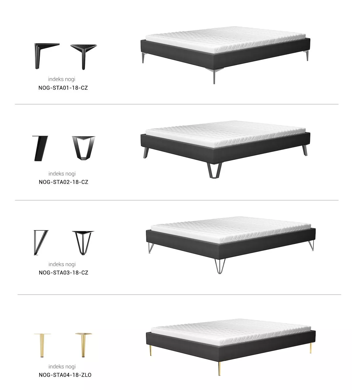 W momencie zamówienia należy wybrać jeden z trzech rodzajów nóżek o wysokości 18 cm, z którymi wykonane będzie łóżko.
