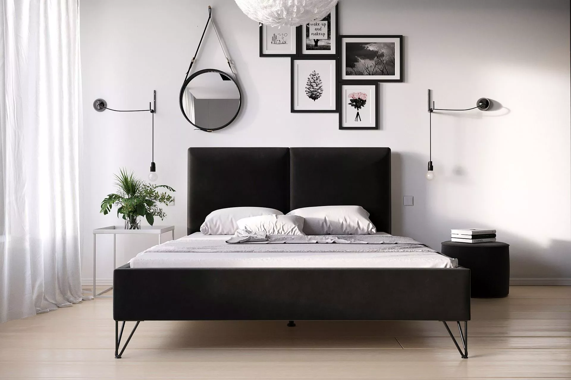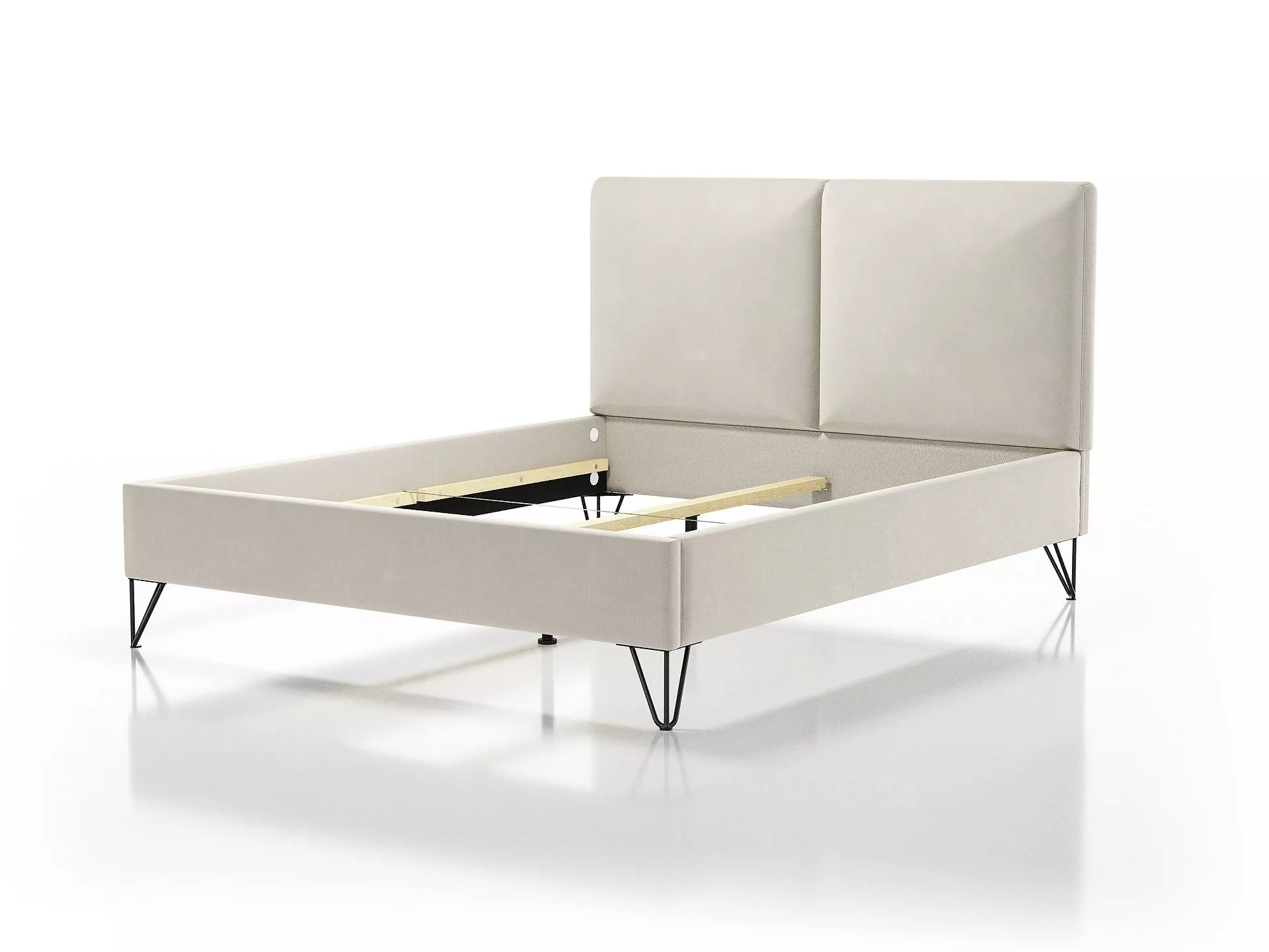 , którego prosta rama zwieńczona minimalistycznym zagłówkiem, zbudowanym z dwóch kwadratowych paneli, tworzą kompozycję idealną do stylowych, nowoczesnych wnętrz.