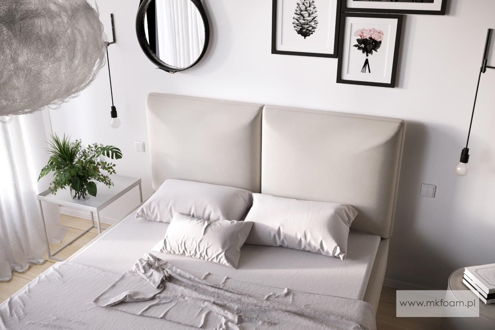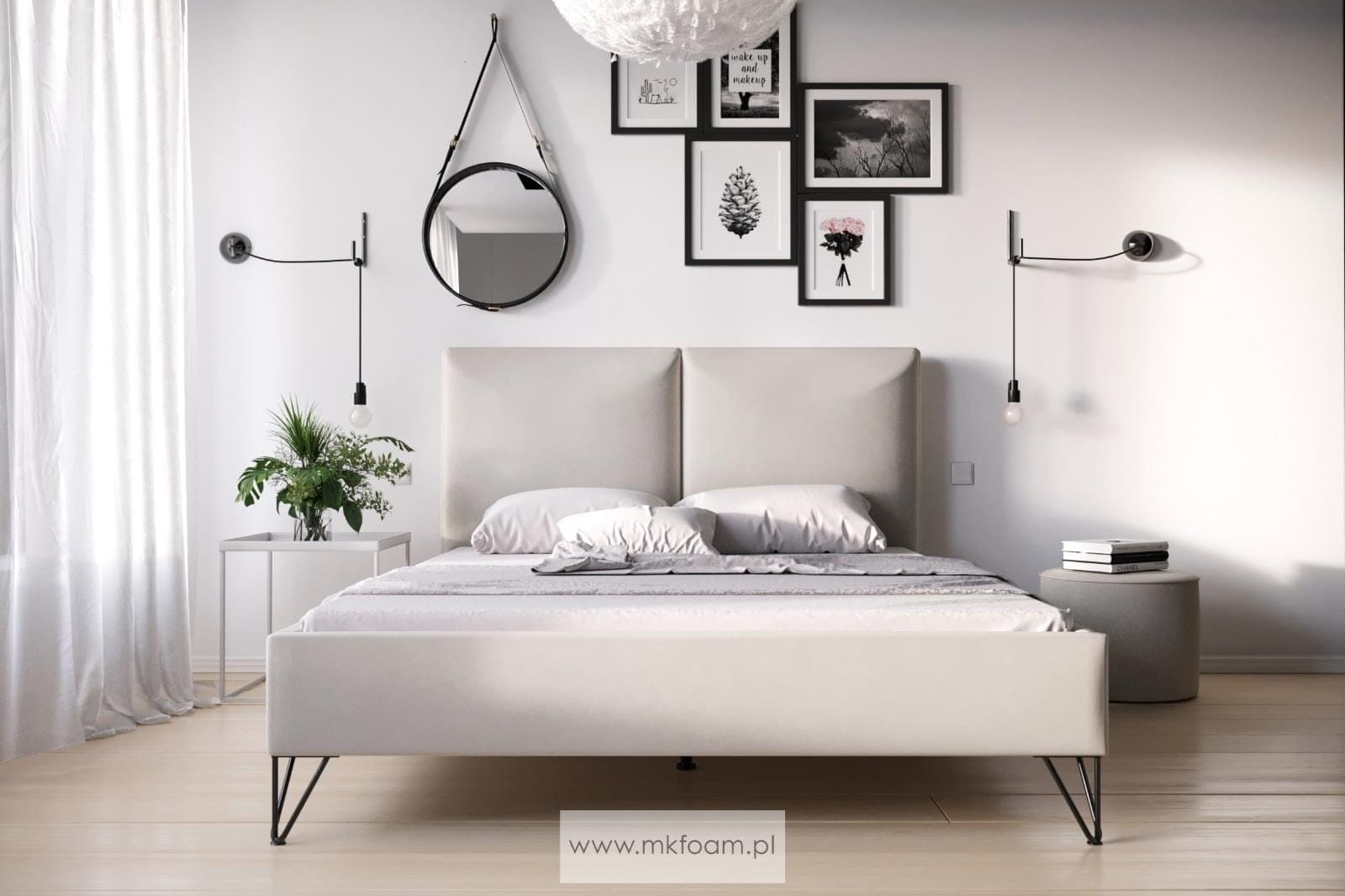 Zagłówek jest mocowany do ramy łóżka, nie ma styczności z podłożem. Konstrukcja z płyty na zewnątrz obita jest tkaniną meblową w szerokiej gamie kolorystycznej. Mebel stoi stabilnie na subtelnych, wysmukłych nóżkach, które dają wrażenie delikatności i lekkości całej konstrukcji. Wzór nóżek do wyboru. Poza standardowymi wymiarami, łóżko jest dostępne również w nietypowej długości i szerokości. Za dodatkową opłatą zagłówek można otapicerować w tylnej części. Dla uzyskania pełnego zadowolenia klienta zalecamy odpowiedni stelaż i materac z naszej oferty.