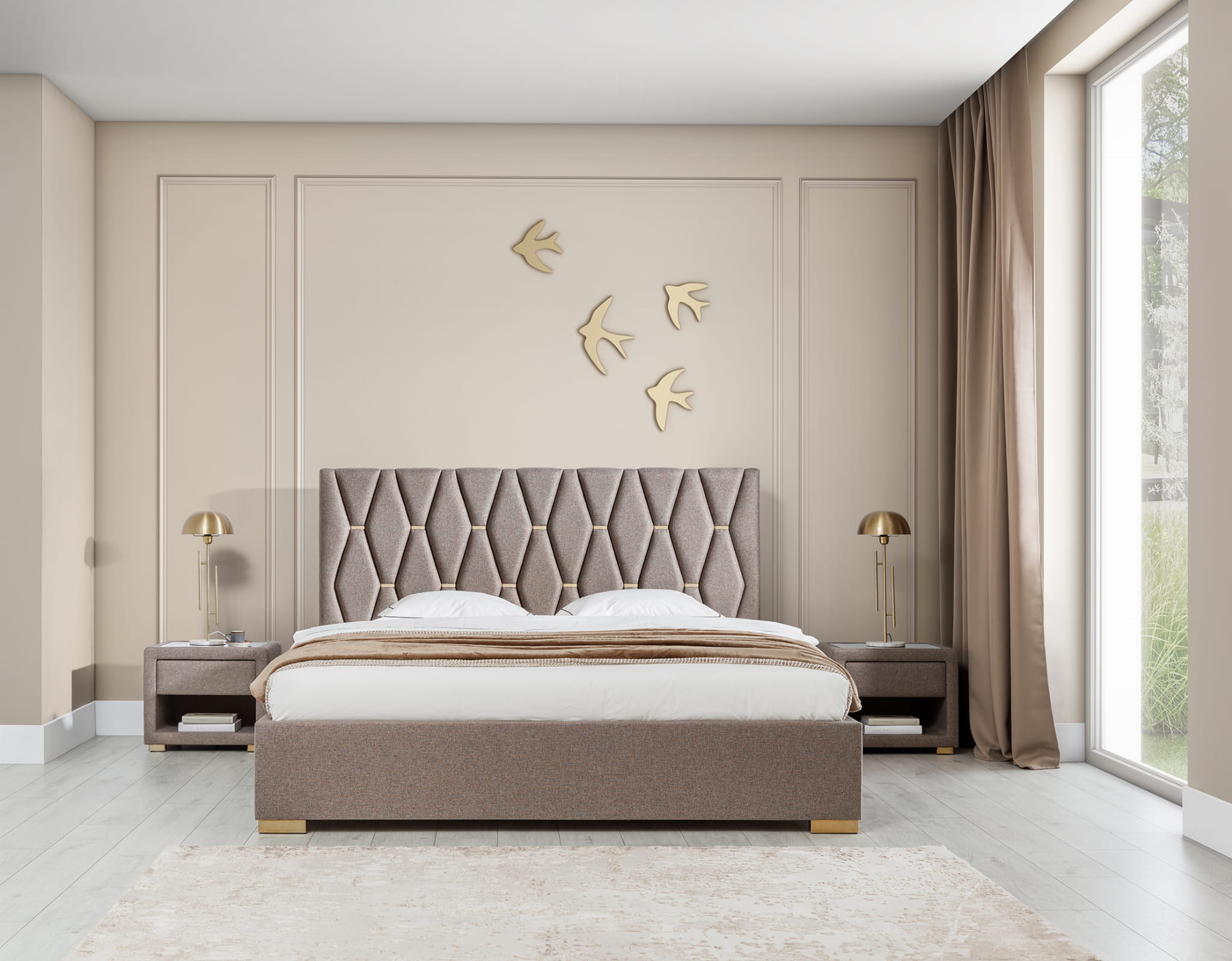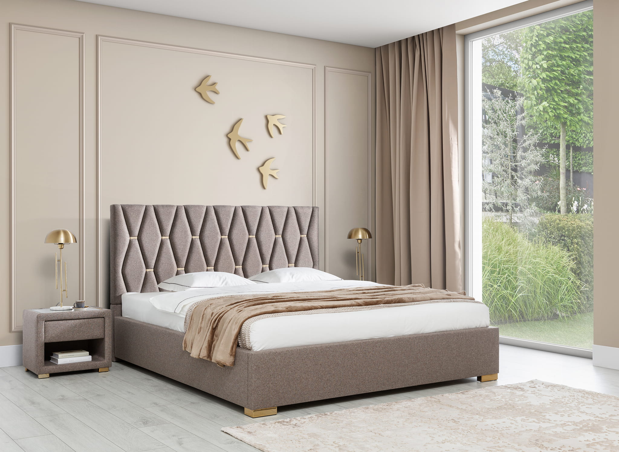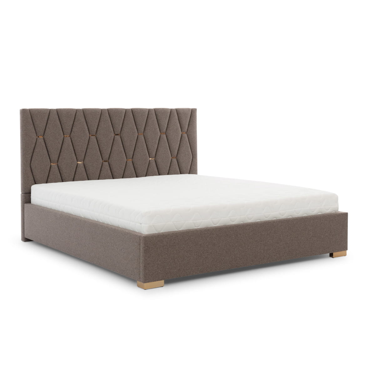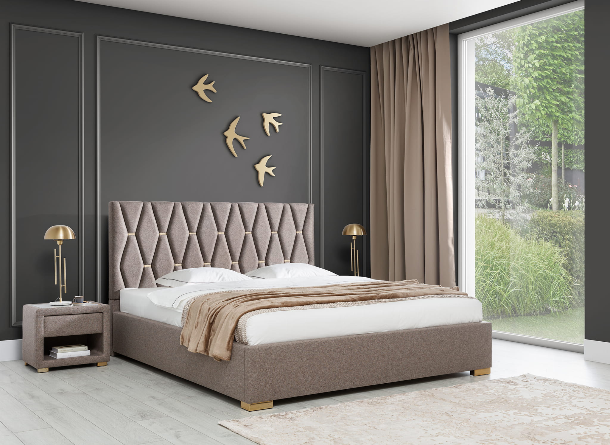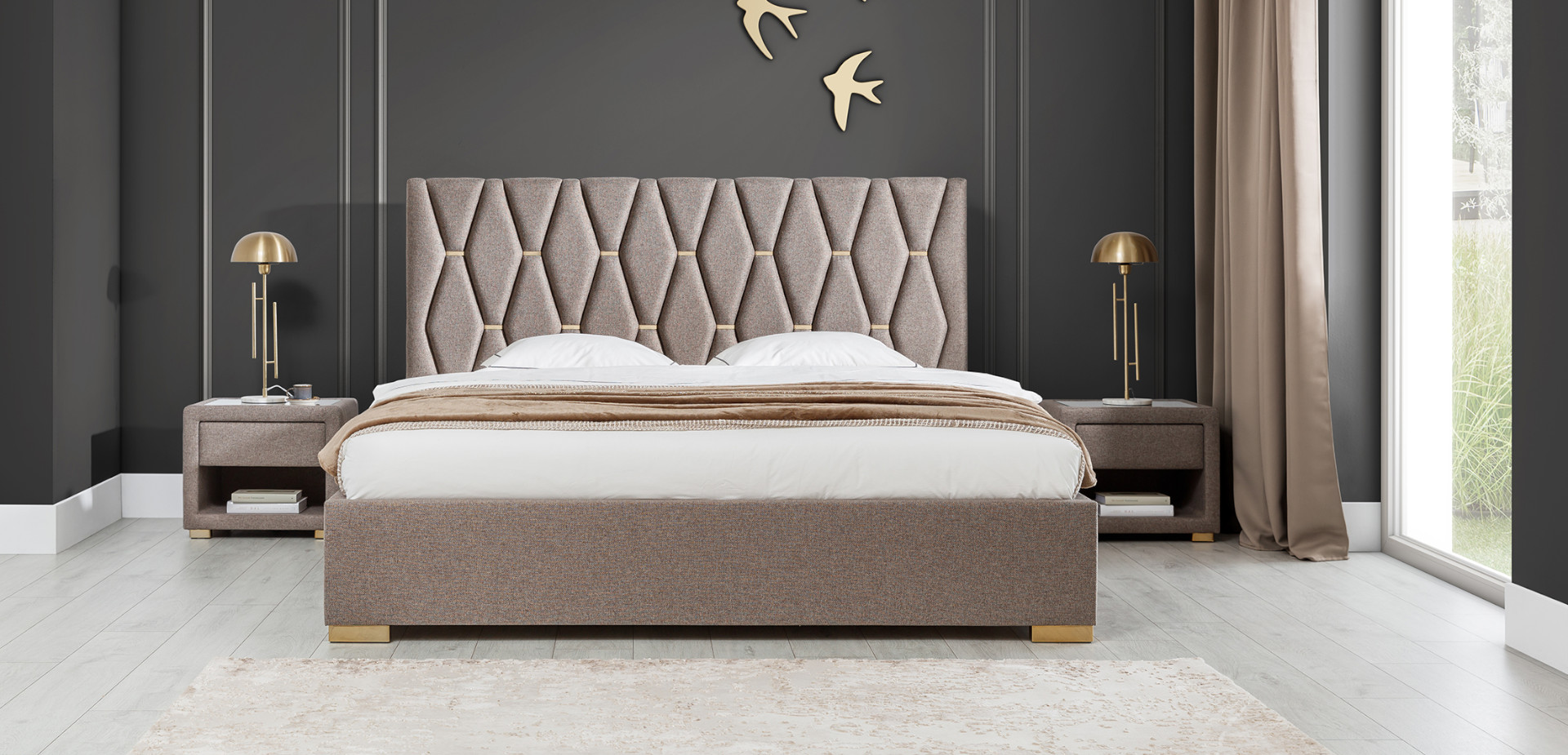 Oryginalne, eleganckie wezgłowie zbudowane z kilkudziesięciu osobnych, specjalnie wymodelowanych i wyprofilowanych elementów tapicerowanych w kształcie pionowych, wydłużonych, ściętych rombów. Każdy element oddzielony jest od pozostałych metalowymi ozdobnymi klamrami. Dzięki temu skomplikowanemu i czasochłonnemu rozwiązaniu wezgłowie wygląda bardzo przestrzennie. Odpowiedni dobór tkaniny sposród kilkuset wzorów podkreśli wypukłość wzoru.