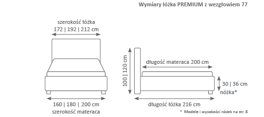 Łóżko dostępne jest w 2 szerokościach - 172 oraz 192 cm (szerokości materacy: 160 oraz 180 cm)