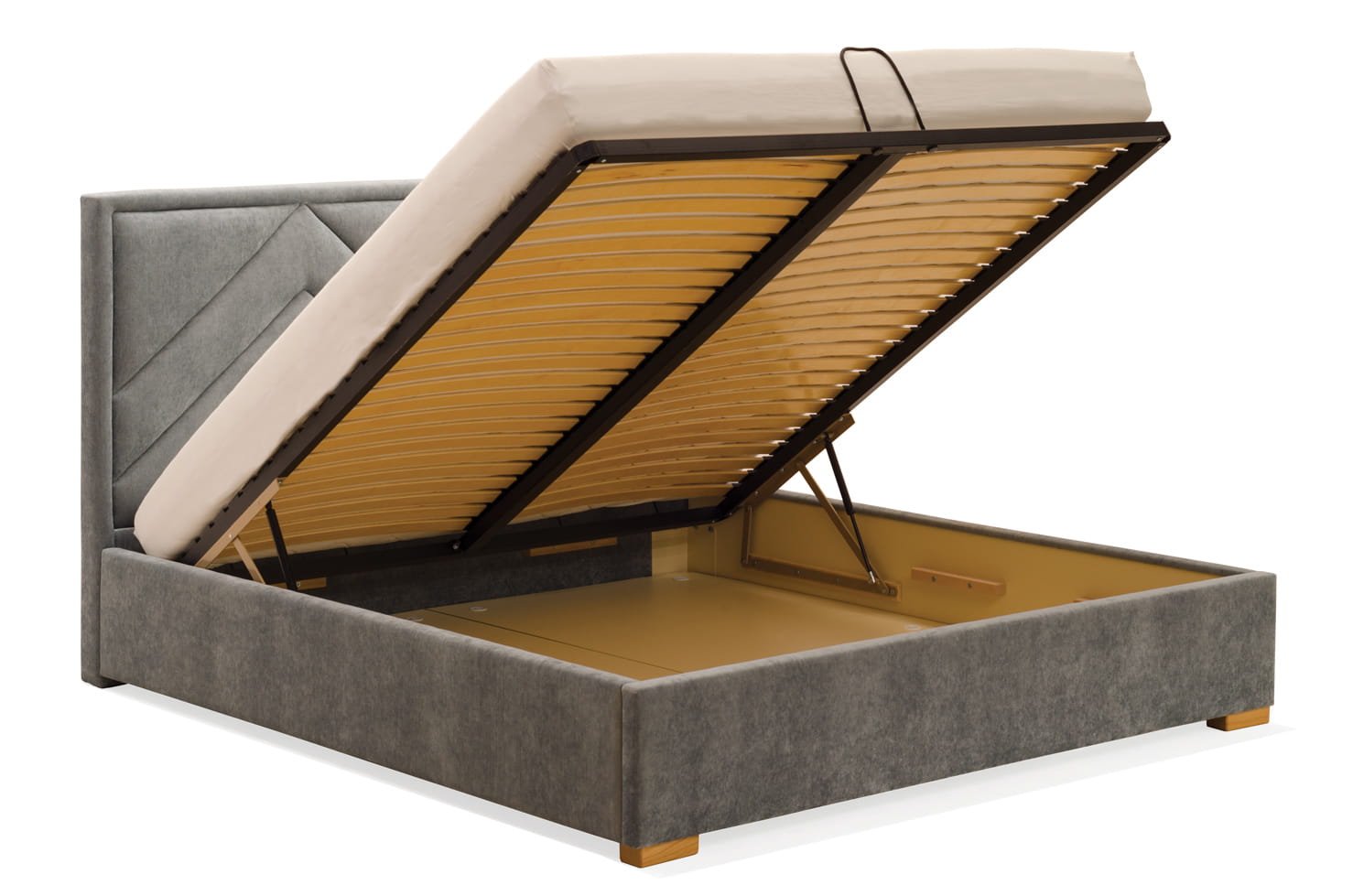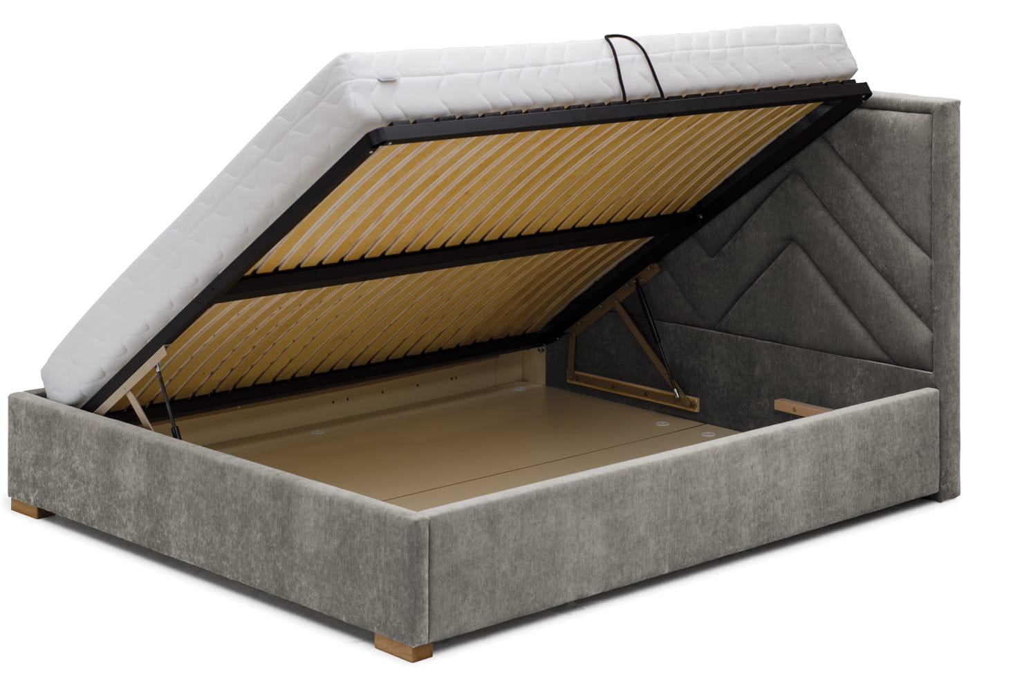 Stelaż w łóżku z pojemnikiem podnoszony na siłownikach gazowych,gięty,gęsto użebrowany odpowiedni do materacy kieszeniowych,lateksowych i piankowych.Podnoszenie stelaża nie stanowi żadnego problemu,dno podwieszone na ramie łóżka, dzięki czemu nawet przy zastosowaniu nóg nie jest widoczne.