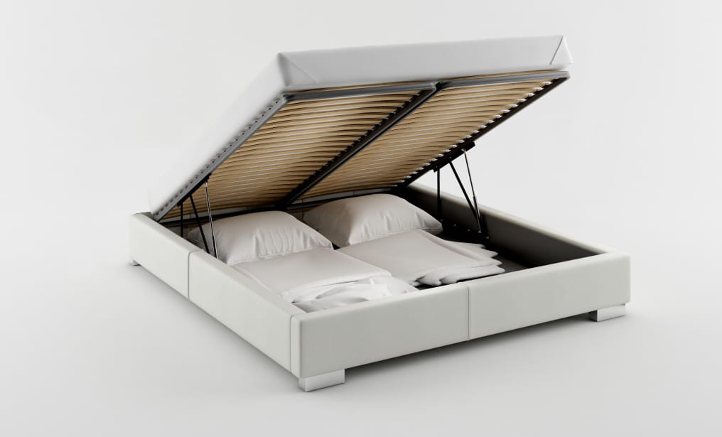 W łóżku z pojemnikiem dzięki zastosowaniu siłowników gazowych podnoszenie stelaża nie stanowi żadnego problemu,dno podwieszone na ramie łóżka, dzięki czemu nawet przy zastosowaniu wysokich nóg nie jest widoczne.