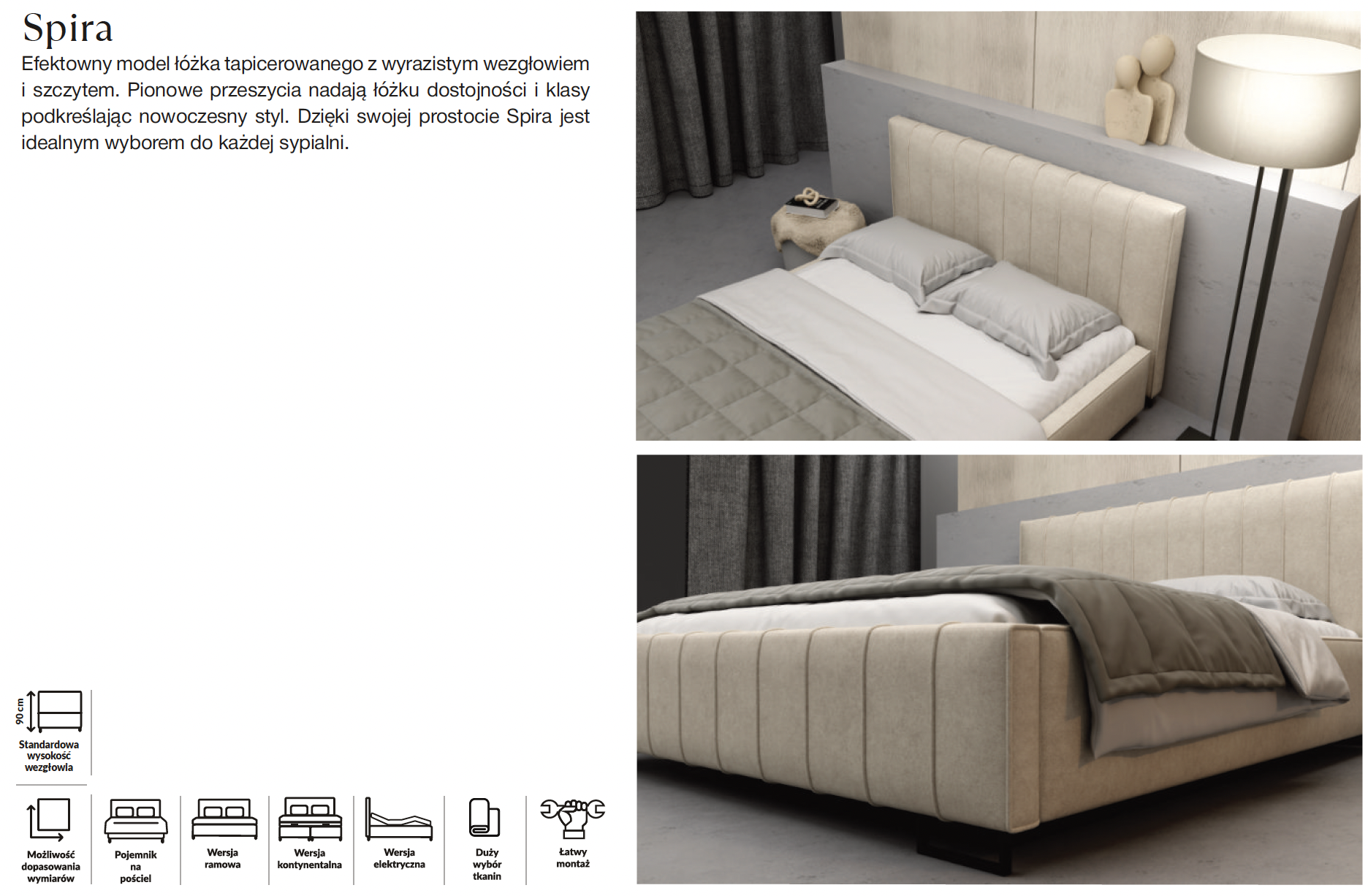 Spira to łóżko, które urzeka prostotą formy i wyrafinowaną estetyką. Efektowne i wyraziste przeszycia na wezgłowiu i szczycie nadają łóżku dostojności i klasy podkreślając nowoczesny styl. Geometryczna prostota łóżka Spira pozwala wprowadzić do wnętrza ład i spokój.