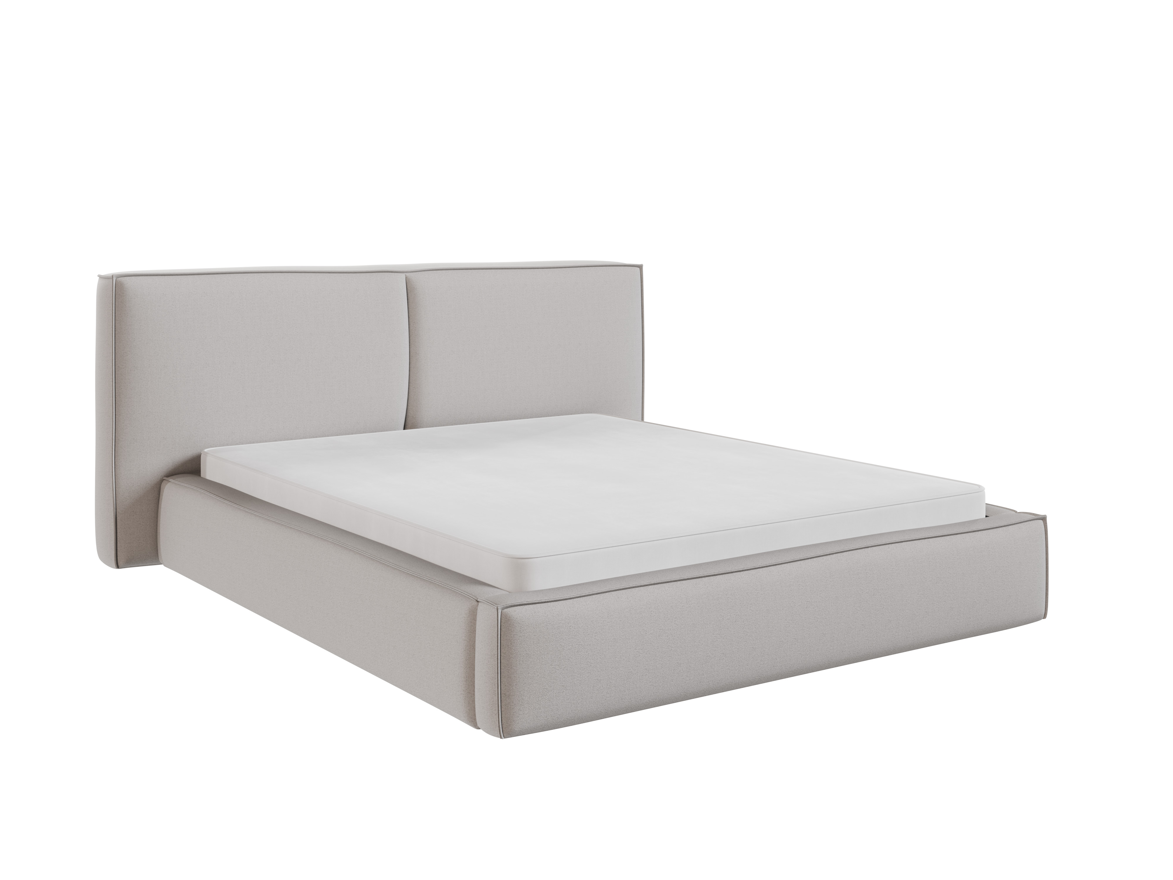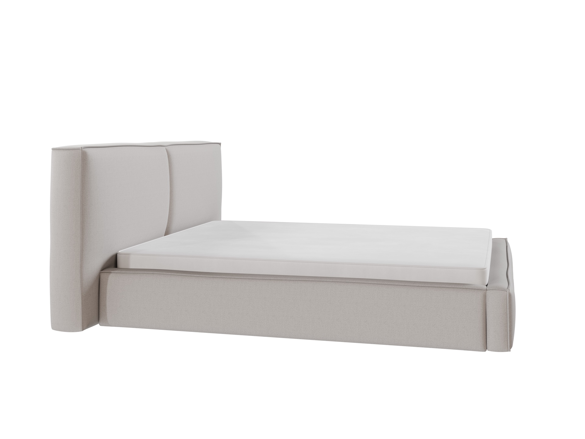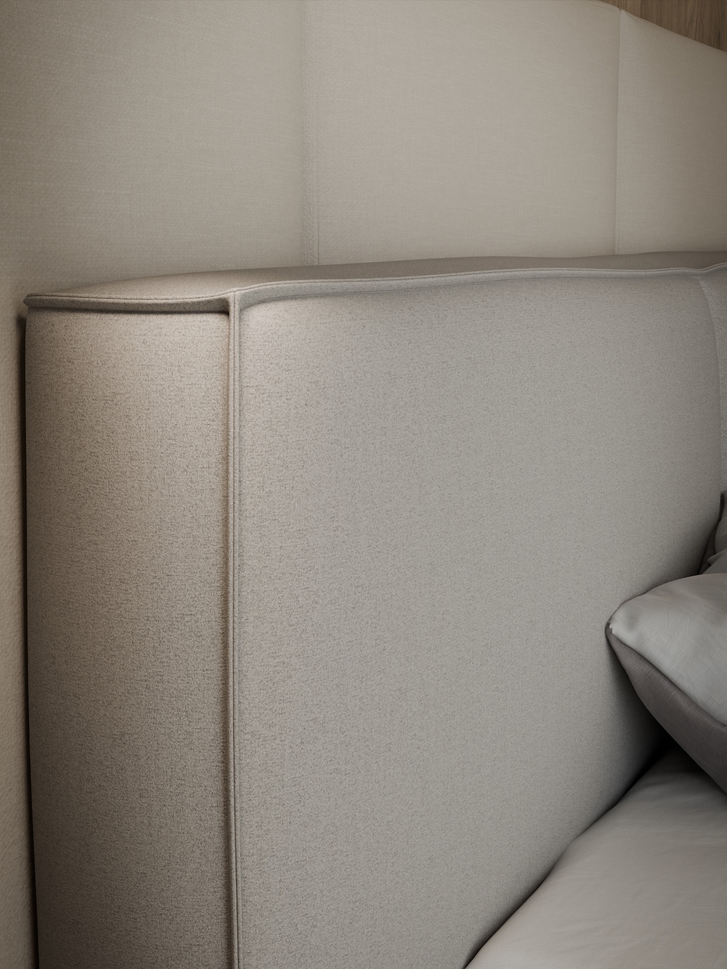 Model Tavira to esencja współczesnej elegancji i komfortu. Jego miękka forma doskonale harmonizuje z nowoczesnymi wnętrzami. Wezgłowie o geometrycznym kształcie pełni zarówno funkcję praktyczną, jak i dekoracyjną, tworząc przytulne tło dla codziennego wypoczynku, nadając sypialni wyjątkowego charakteru. Łóżko zostało osadzone na niskiej ramie, co wprowadza poczucie przestrzeni i lekkości. Całość dopełniają subtelne i eleganckie przeszycia na krawędziach łóżka.