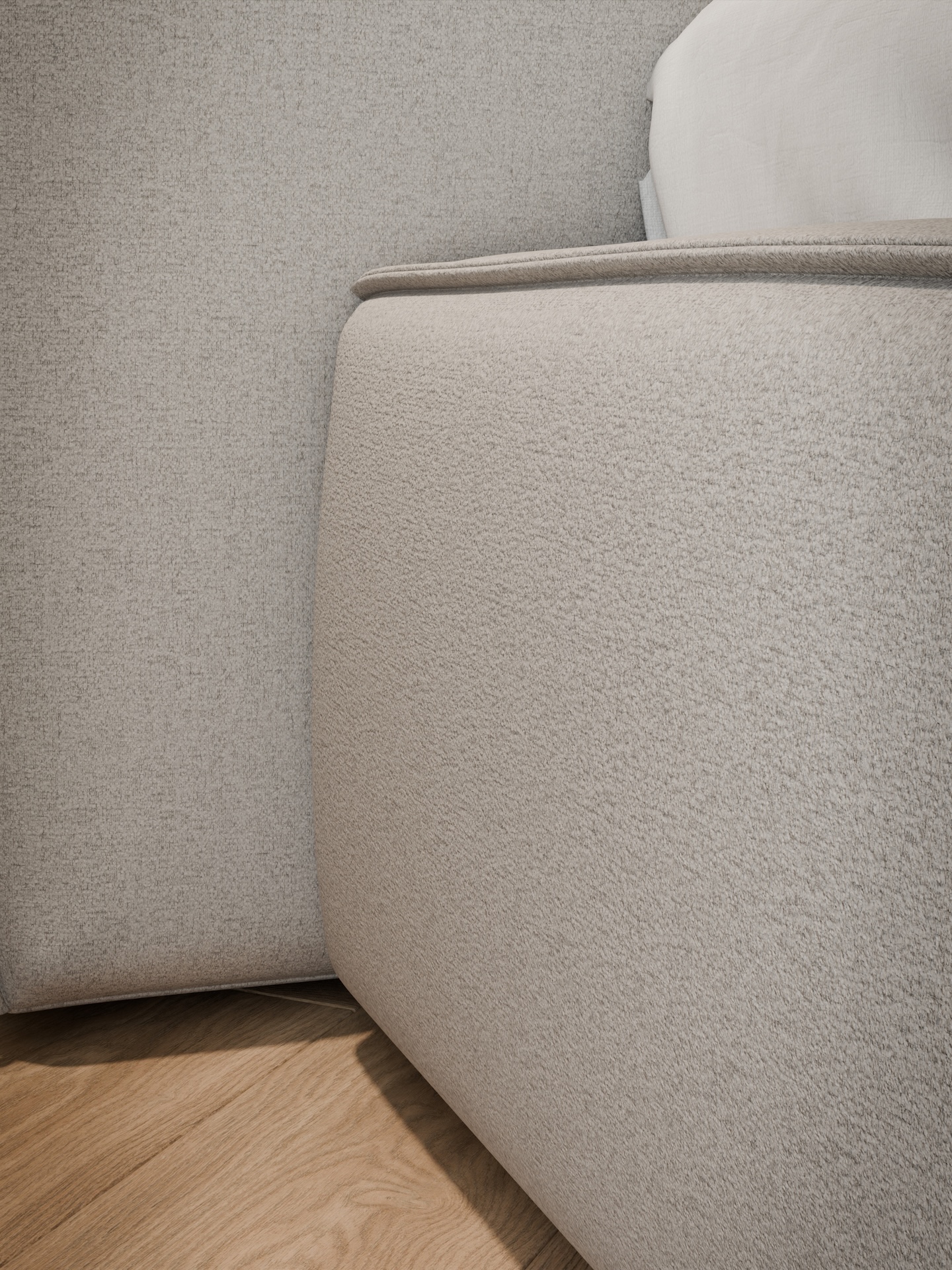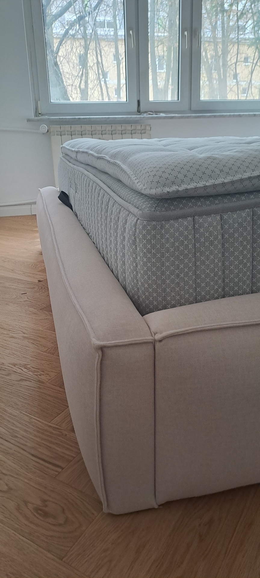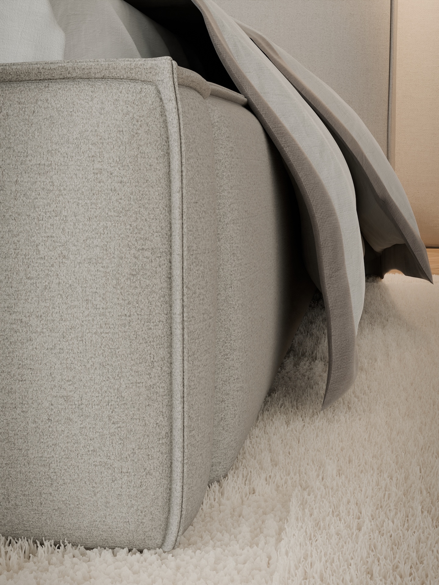 Model Tavira to esencja współczesnej elegancji i komfortu. Jego miękka forma doskonale harmonizuje z nowoczesnymi wnętrzami. Wezgłowie o geometrycznym kształcie pełni zarówno funkcję praktyczną, jak i dekoracyjną, tworząc przytulne tło dla codziennego wypoczynku, nadając sypialni wyjątkowego charakteru. Łóżko zostało osadzone na niskiej ramie, co wprowadza poczucie przestrzeni i lekkości. Całość dopełniają subtelne i eleganckie przeszycia na krawędziach łóżka.