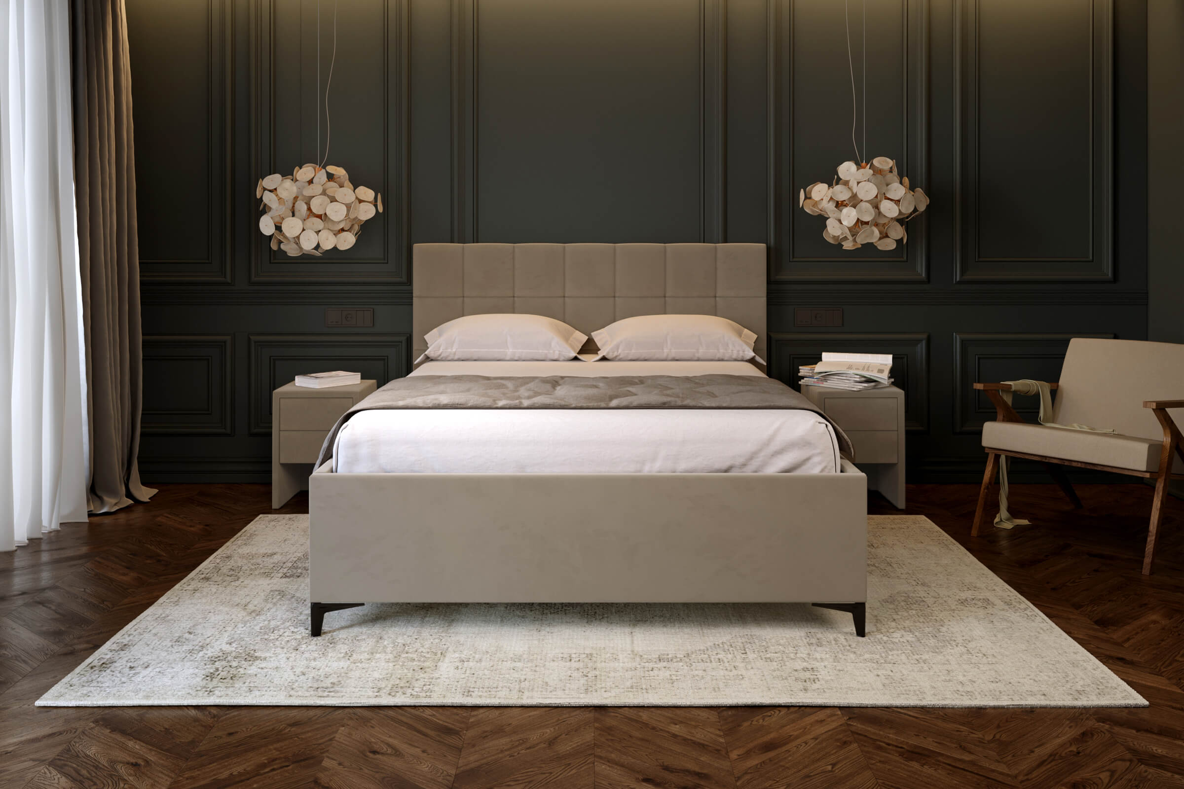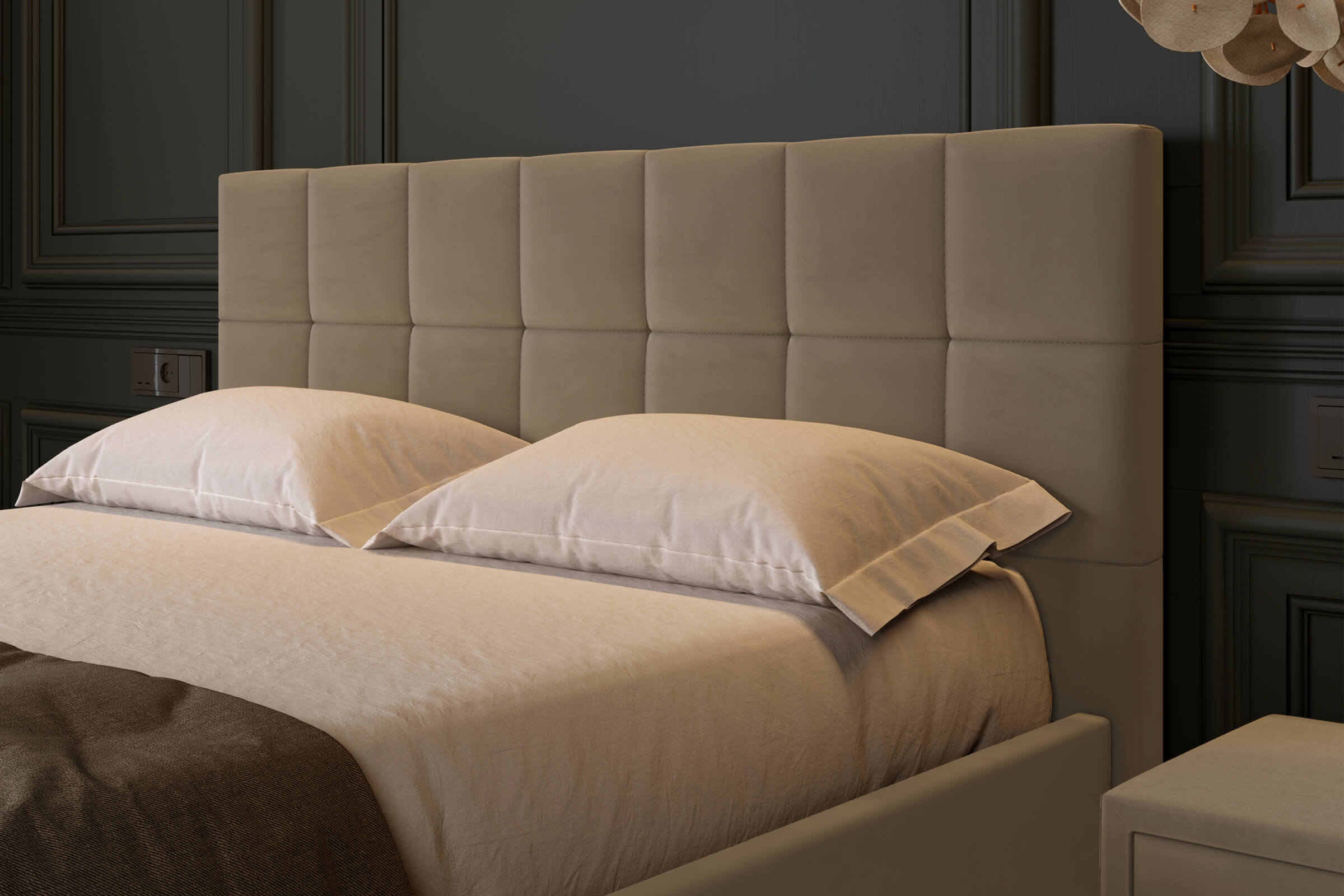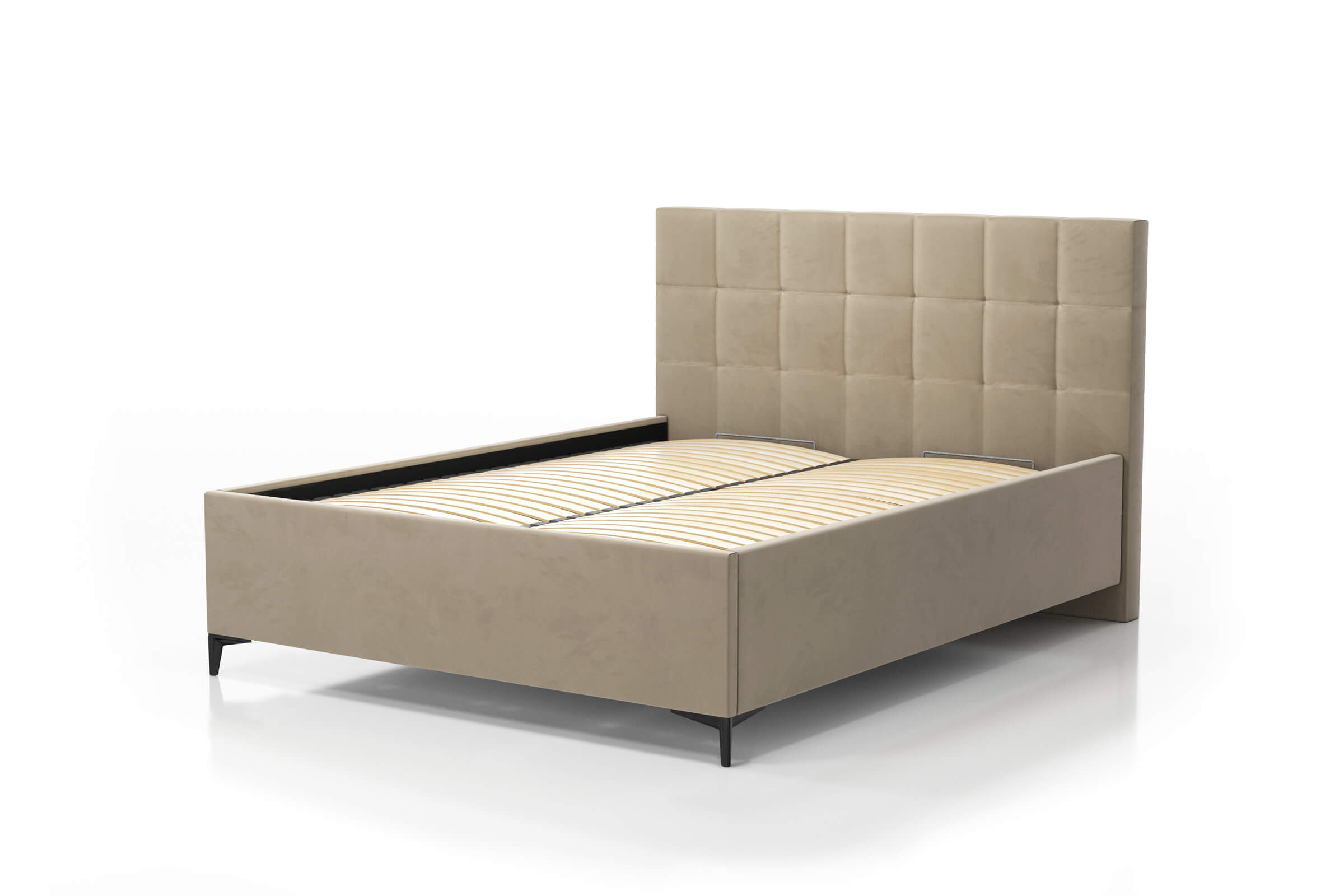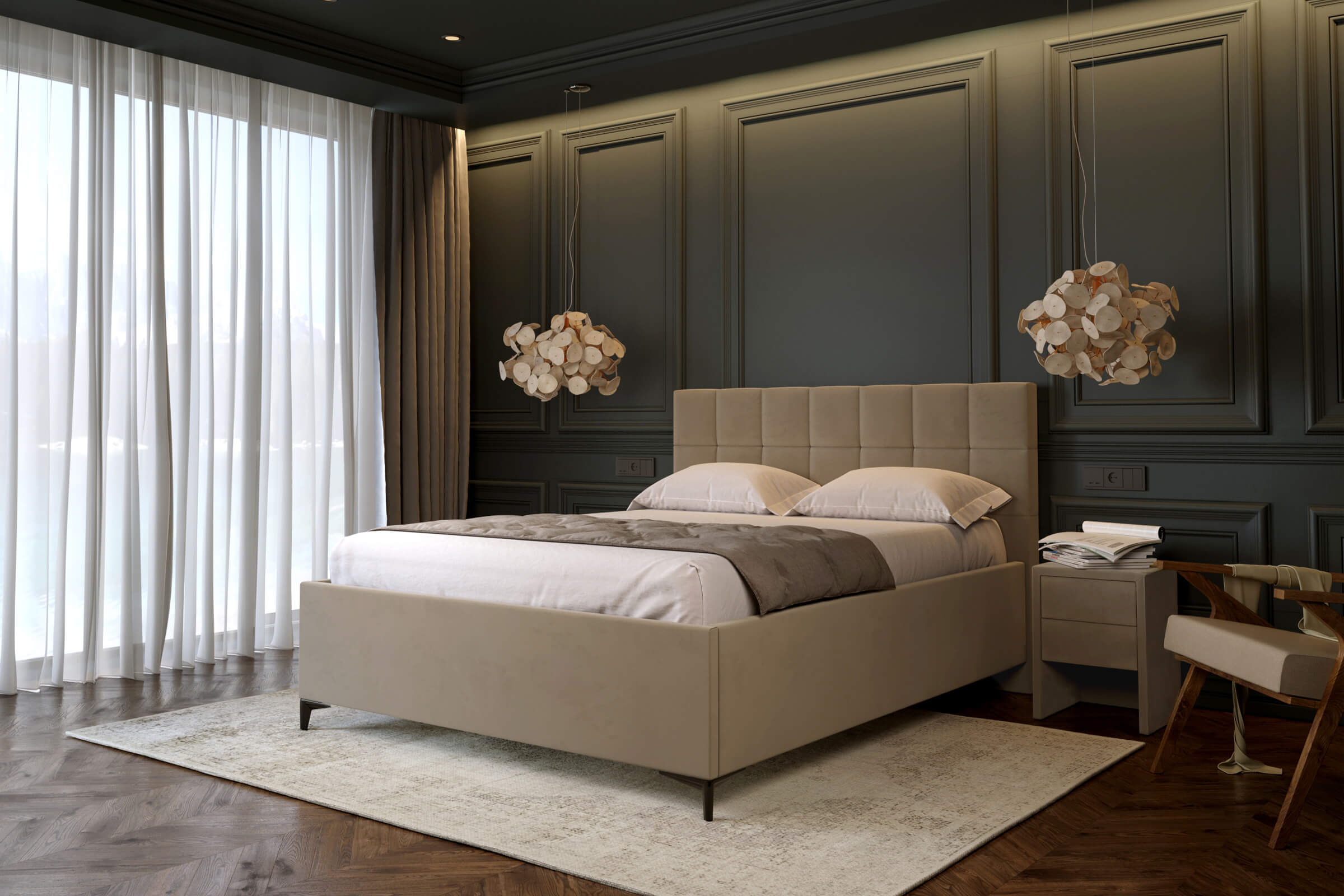 Łóżko o klasycznej konstrukcji, pasujące do każdego rodzaju wnętrza. Posiada zagłówek z geometrycznymi przeszyciami o wysokości około 118 cm i grubości około 8 cm.