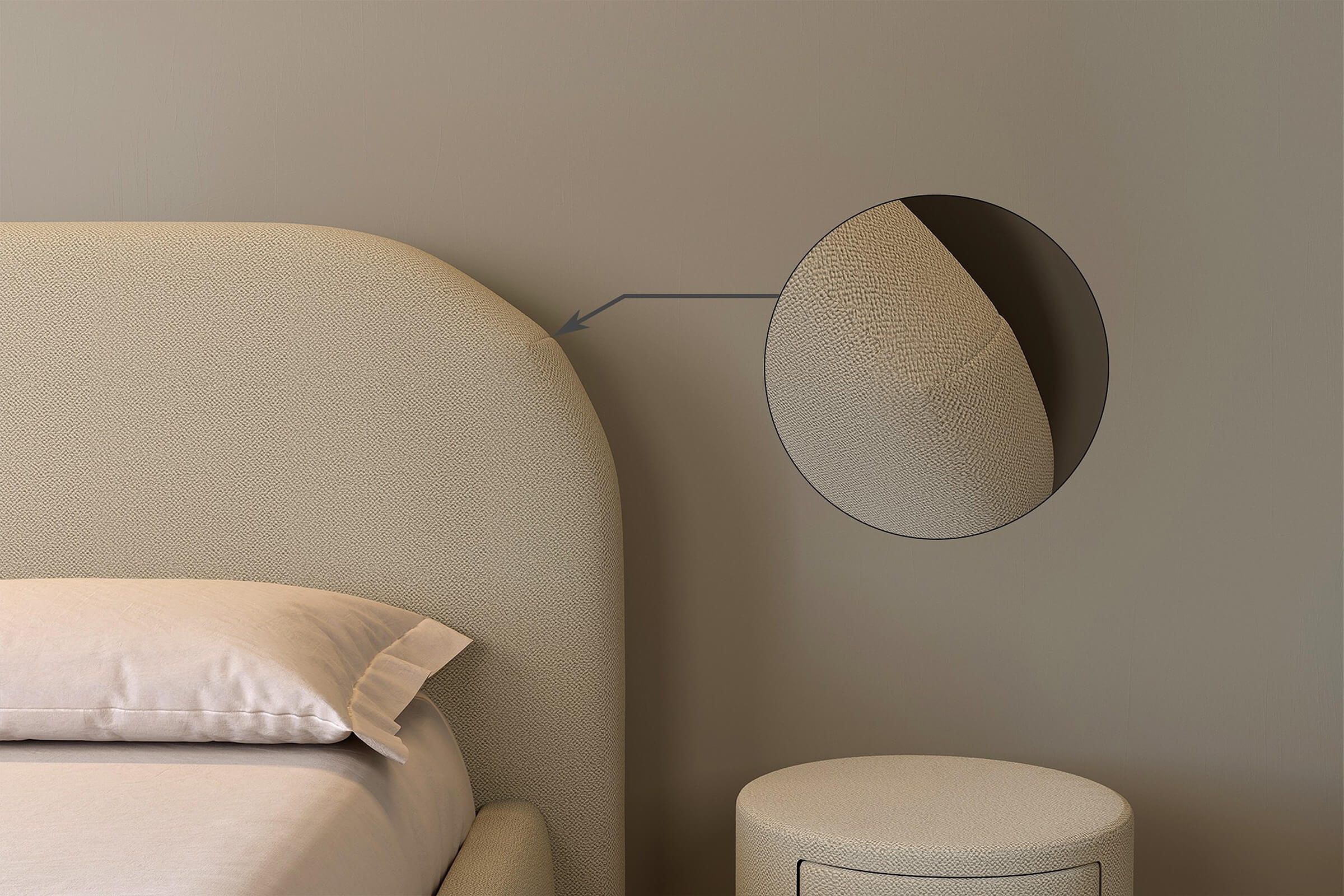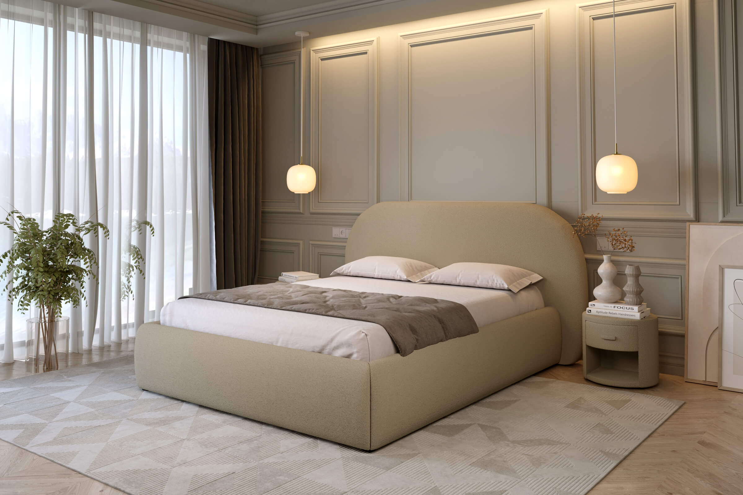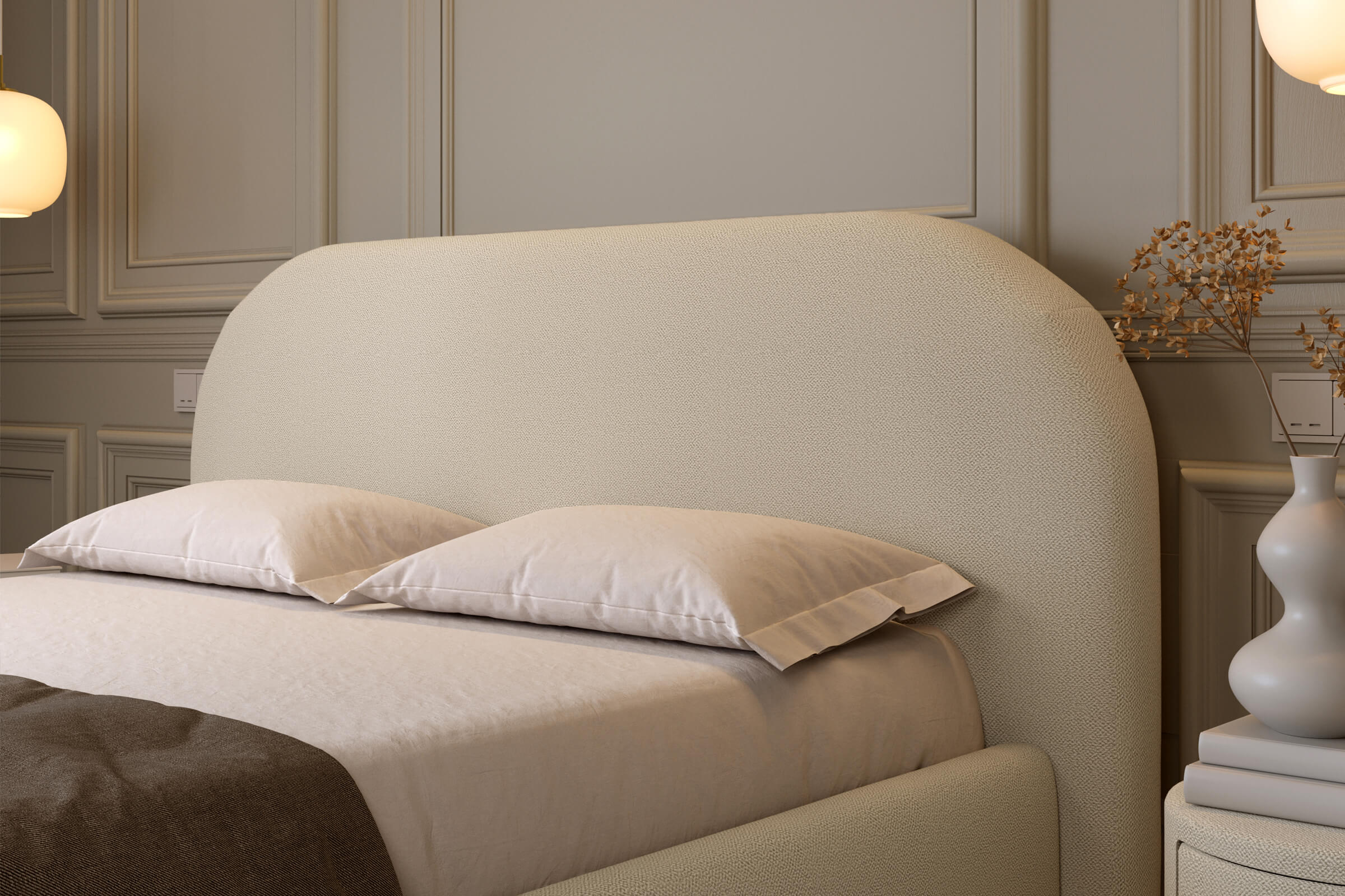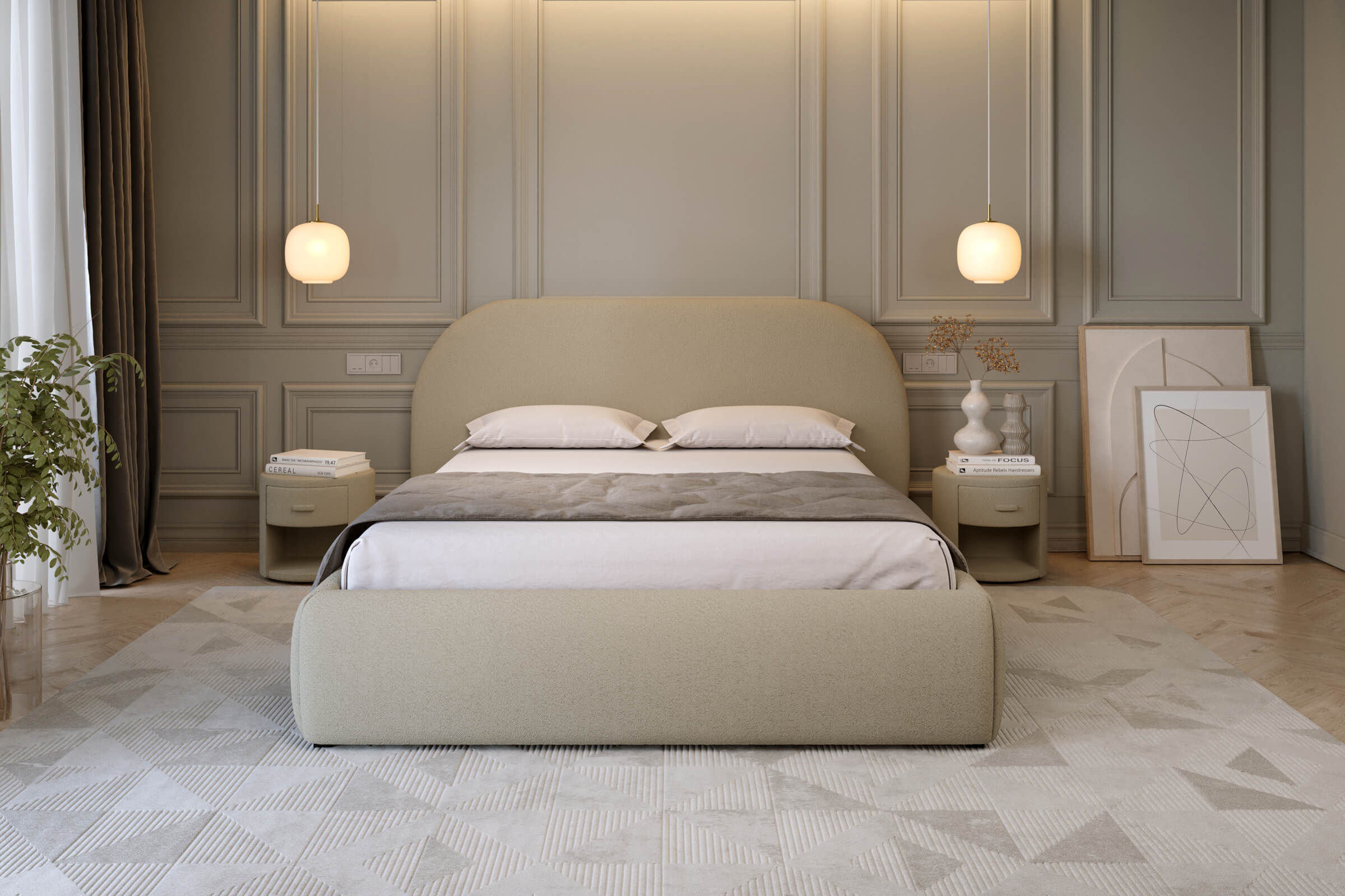 Subtelnie wyprofilowany zagłówek i delikatne linie ramy tworzą harmonijną, minimalistyczną kompozycję, a łagodne wykończenia dodają każdej sypialni wyjątkowego uroku.