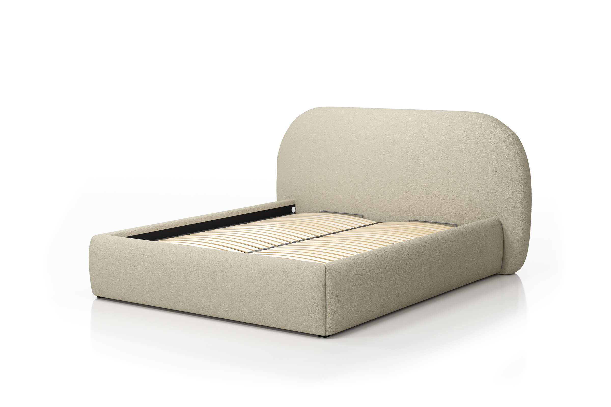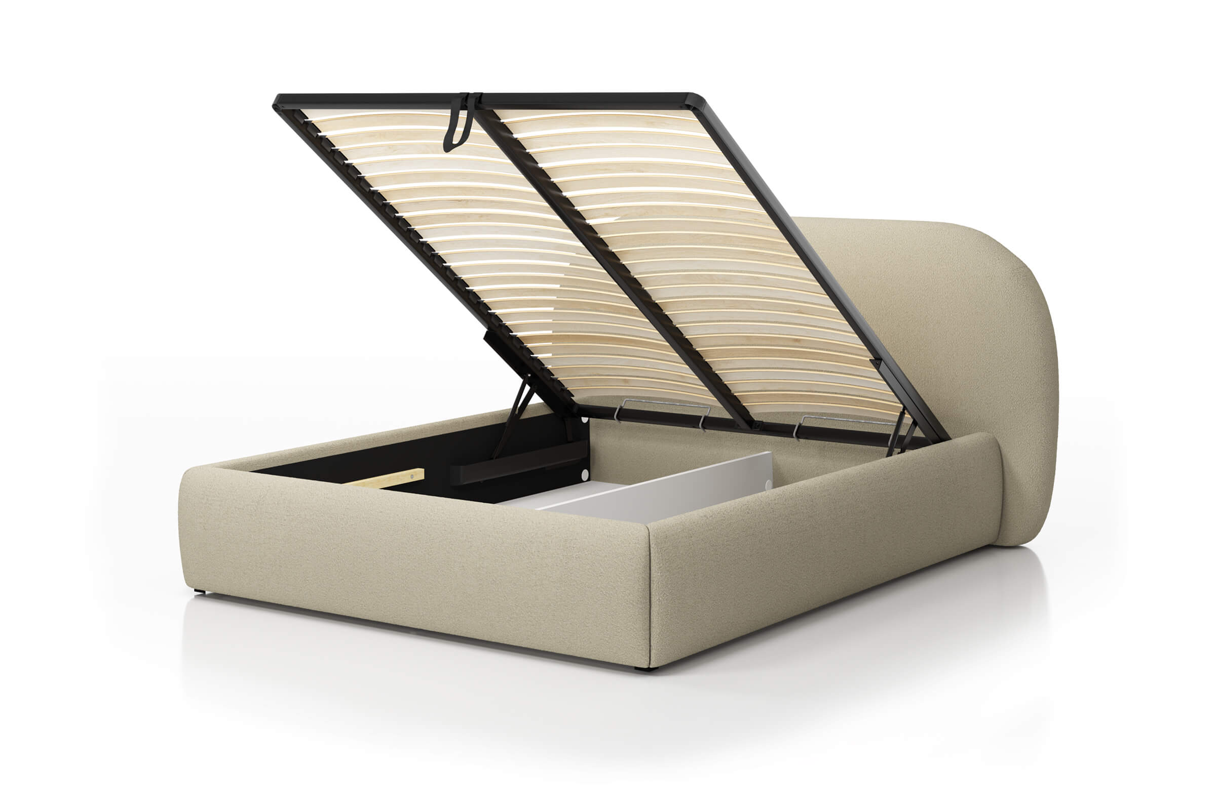 Rama łóżka otwiera się za pomocą siłowników gazowych, co ułatwia dostęp do pojemnika na pościel i sprawia, że codzienne korzystanie jest wyjątkowo wygodne.