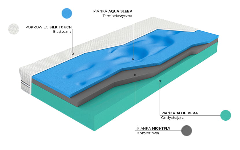 Wkład: włoska termoelastczyna piana AQUA SLEEP - 3 cm; komfortowa pianka NIGHTFLY-5 cm; piana ALOE VERA z aktywnymi mikrokapsulami aloesowymi - 14 cm