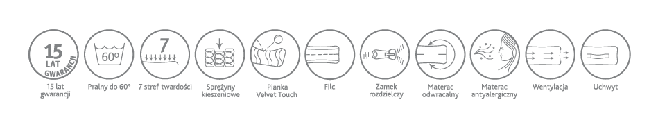 to rolowany materac, który sprawdzi się m.in. w przypadku par oraz seniorów. Konstrukcja na bazie sprężyn kieszeniowych z 7 strefami zróżnicowanej twardości gwarantuje bardzo wysoką elastyczność punktową. Każda sprężynka reaguje osobno, dzięki czemu partner nie odczuwa naszych ruchów w trakcie snu. Po obu stronach wkładu znajduje się innowacyjna pianka Velvet Touch, która charakteryzuje się wysoką sprężystością i optymalną twardością. Struktura pianki zapewnia bardzo dobrą wentylację całego wkładu, co przekłada się na odpowiednią higienę snu. Po obu stronach sprężyn znajdują się dodatkowe warstwy filcu, które zwiększają twardość materaca. Kręgosłup zyskuje doskonałe wsparcie, nawet w przypadku osób o większej wadze.