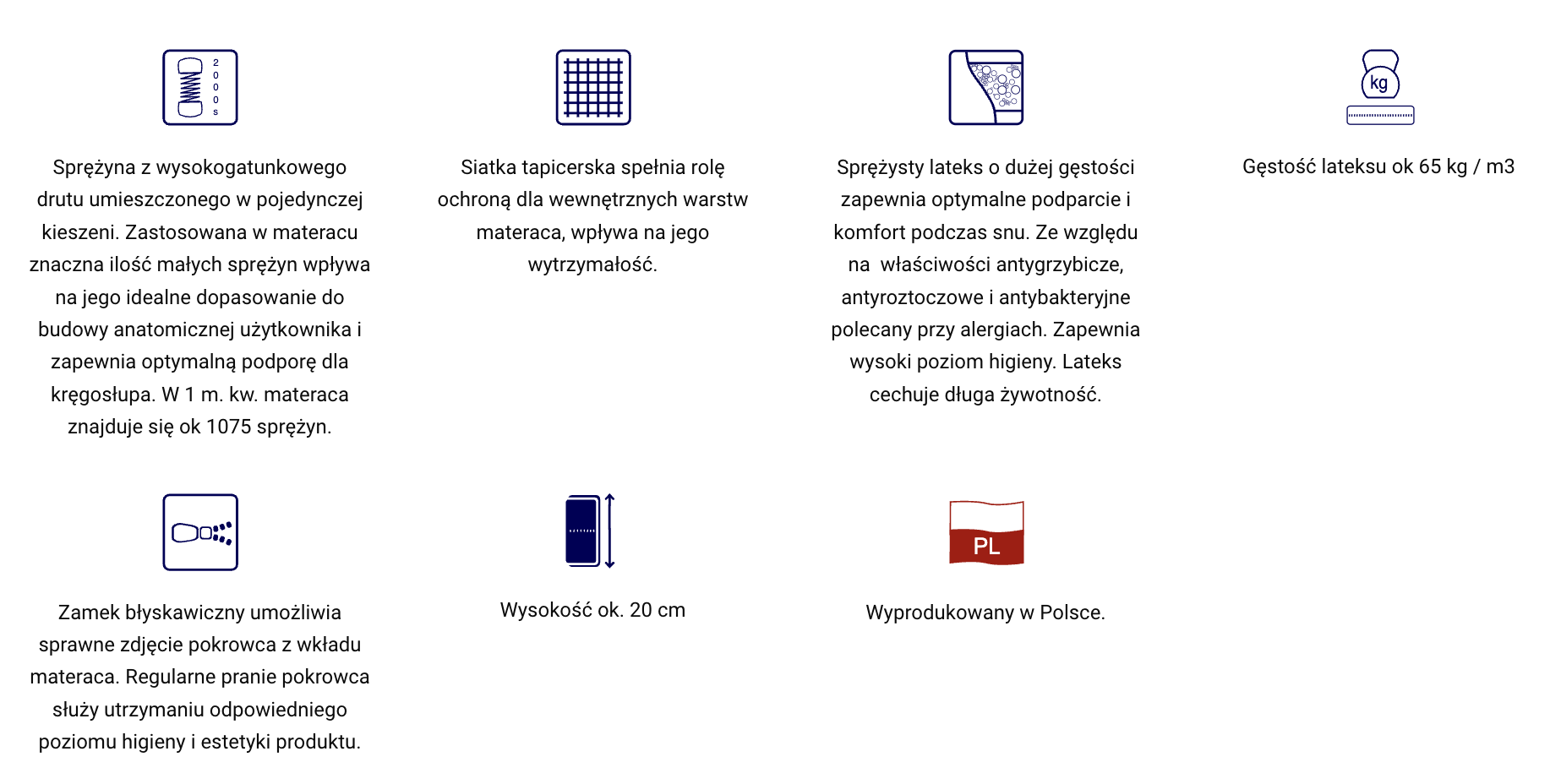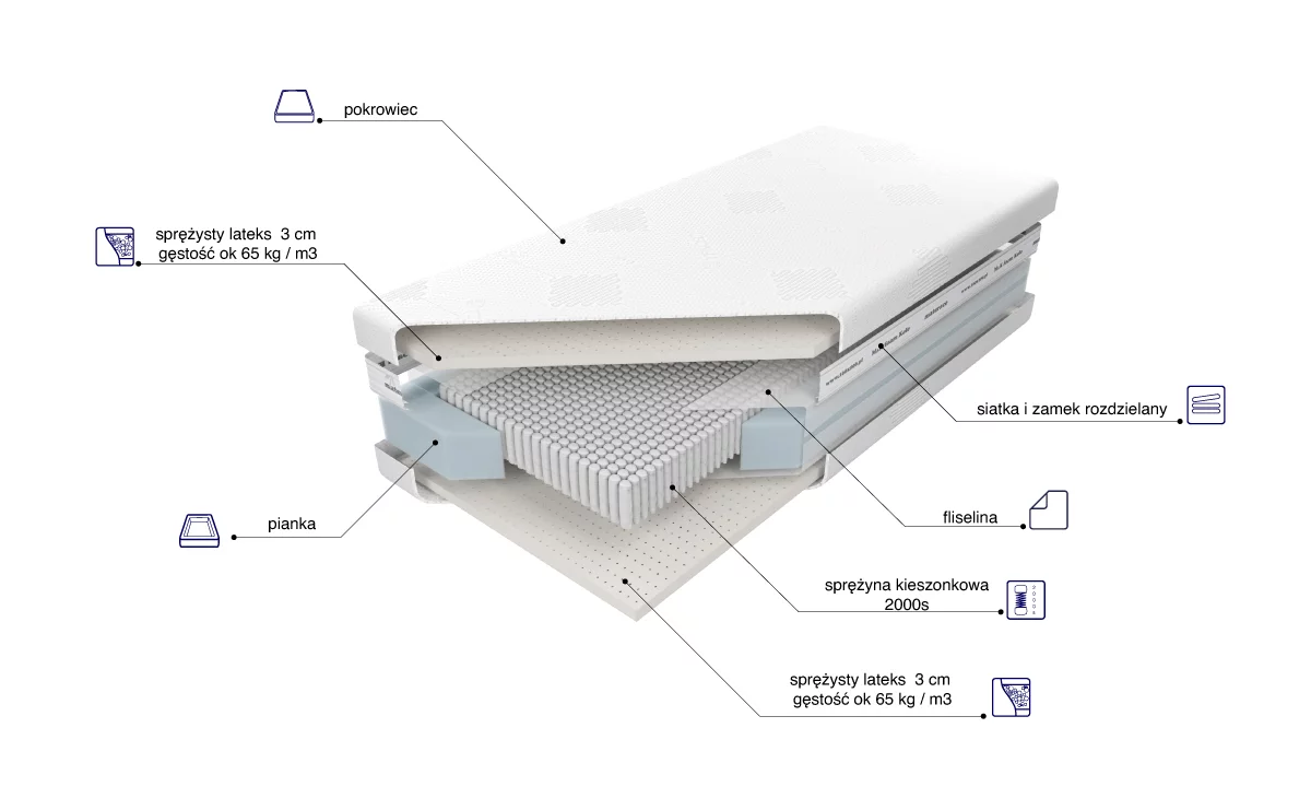 o wysokości ok. 20 cm (w zależności od pokrowca) zbudowany ze sprężyn 2000S z wysokogatunkowego drutu, umieszczonych w pojedynczych kieszonkach o średnicy 25 mm. Ilość użytych sprężyn znacząco poprawia elastyczność i zwiększa punktowe podparcie ciała. Po obu stronach materaca została użyta 3 cm warstwa lateksu o dużej gęstości, zapewniającego optymalne podparcie i wygodę podczas snu. Posiada właściwości antygrzybiczne, antyroztoczowe i antybakteryjne, cechuje się długą żywotnością. Obustronnie zastosowana siatka tapicerska wzmacnia konstrukcję materaca i wspomaga jego wentylację. Zastosowanie zamka błyskawicznego, który umożliwia zdjęcie i wypranie pokrowca, znacząco ułatwia utrzymanie go w czystości.