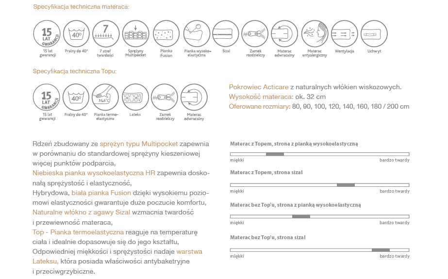 Dostępne rozmiary: 80, 90, 100, 120, 140, 160, 180 / 200 cm