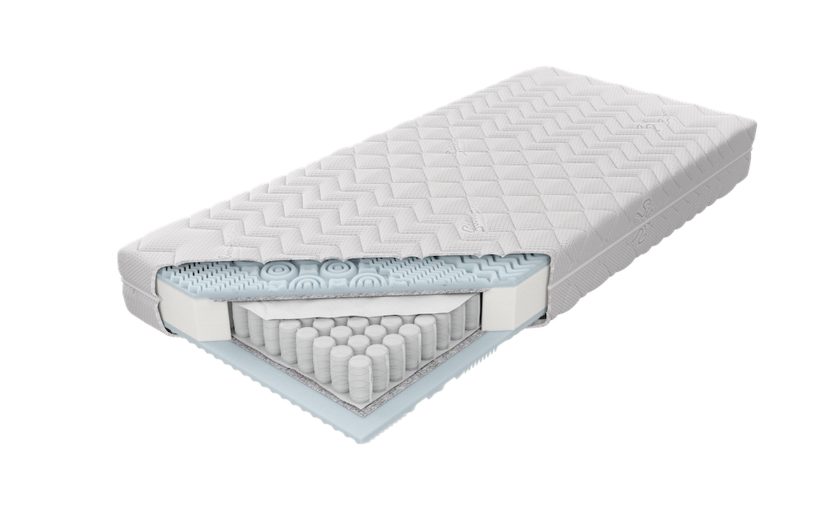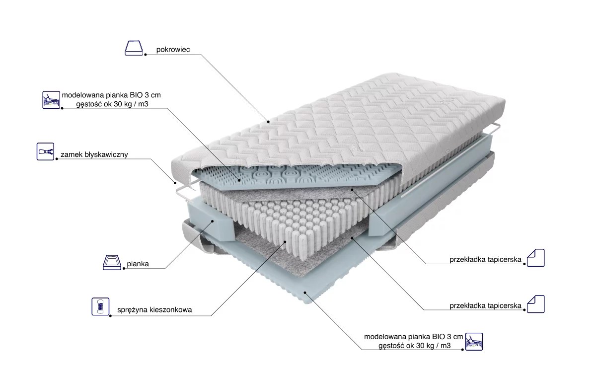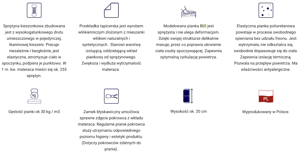 o wysokości ok. 20 cm (w zależności od pokrowca) zbudowany ze sprężyn Pocket z wysokogatunkowego drutu, umieszczonych w pojedynczych kieszonkach o średnicy 5,8 mm.Takie rozwiązanie poprawia elastyczność i zwiększa punktowe podparcie ciała.  Po obu stronach materaca została użyta 3 cm warstwa modelowanej i niezwykle sprężystej pianki Bio. Zapewnia optymalną cyrkulację powietrza.  Zastosowana obustronnie przekładka tapicerska doskonale izoluje wkład piankowy od sprężynowego, zwiększając wytrzymałość materaca i wydłużając jego żywotność. Wykorzystanie zamka błyskawicznego, który umożliwia zdjęcie i wypranie pokrowca, znacząco ułatwia utrzymanie go w czystości.