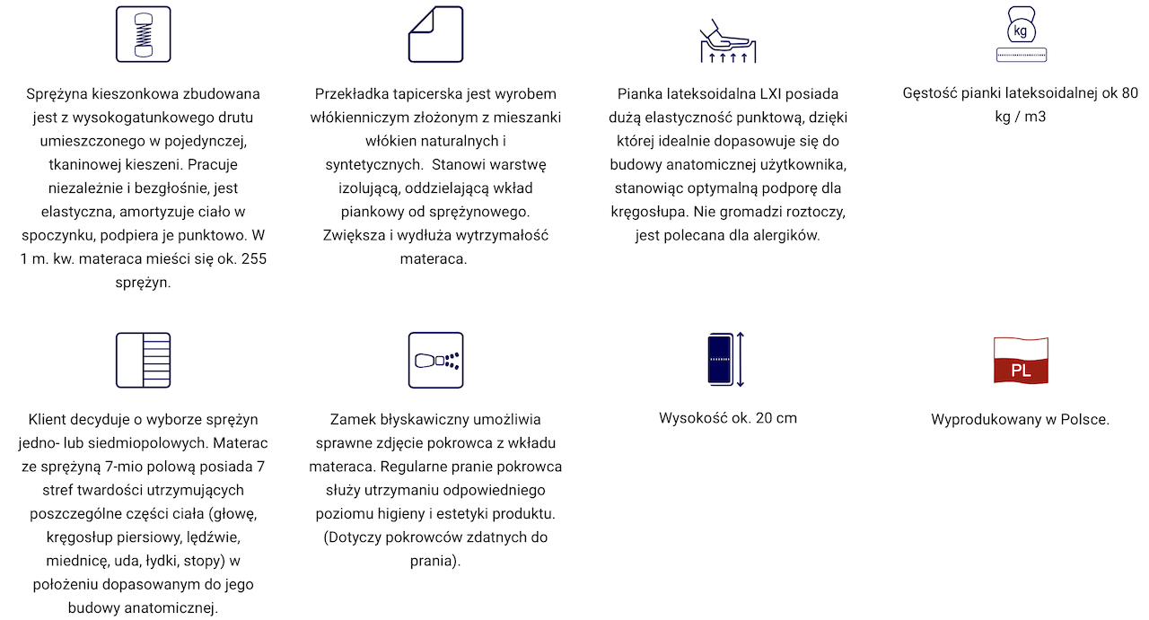 o wysokości ok. 20 cm (w zależności od pokrowca) zbudowany ze sprężyn Pocket z wysokogatunkowego drutu, umieszczonych w pojedynczych kieszonkach o średnicy 5,8 mm. Takie rozwiązanie poprawia elastyczność i zwiększa punktowe podparcie ciała. Po obu stronach materaca została użyta 3 cm warstwa pianki lateksoidalnej posiadającej dużą elastyczność punktową, dzięki której idealnie dopasowuje się do budowy anatomicznej użytkownika, stanowiąc optymalną podporę dla kręgosłupa. Nie gromadzi roztoczy, jest polecana dla alergików.