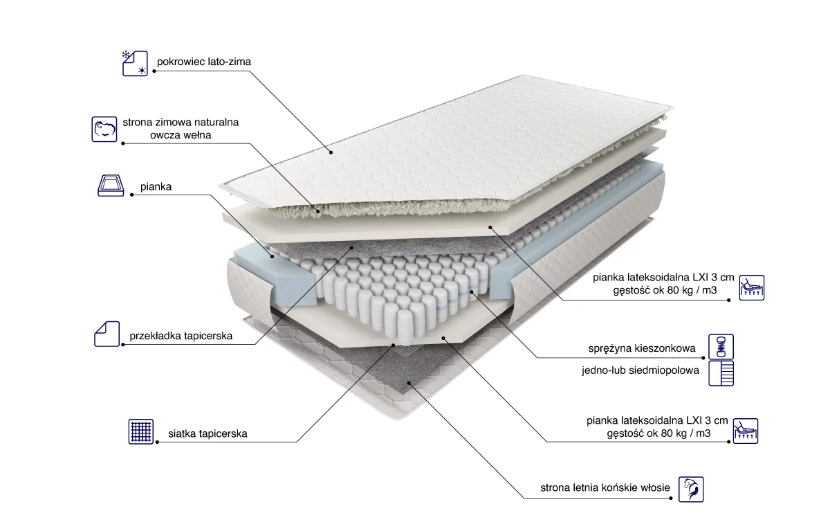 Zastosowana po jednej stronie siatka tapicerska wzmacnia konstrukcję materaca i wspomaga jego wentylację, natomiast użyta po odwrotnej stronie przekładka tapicerska doskonale izoluje, zwiększając twardość i wytrzymałość materaca. Wykorzystanie zamka błyskawicznego, który umożliwia zdjęcie i wypranie pokrowca, znacząco ułatwia utrzymanie go w czystości. Pozbawiony możliwości zdjęcia jest pokrowiec typu lato-zima, posiadający od strony letniej owatę antyalergiczną, a od strony zimowej naturalną owczą wełnę.