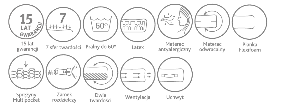 Gwarancja: wkład materaca objęty jest 15 letnią gwarancją, pokrowiec objęty jest 2 letnią gwarancją
