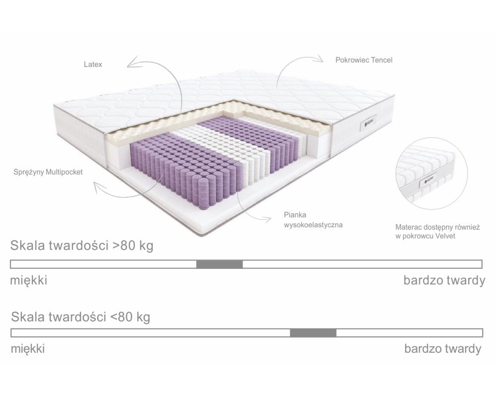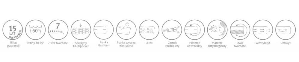 7-strefowa sprężyna kieszeniowa Multipocket, po jednej stronie profilowany lateks połączony z pianką Flexifoam o wys. 3,5 cm, po drugiej stronie pianka wysokoelastyczna HR o wys. 4 cm