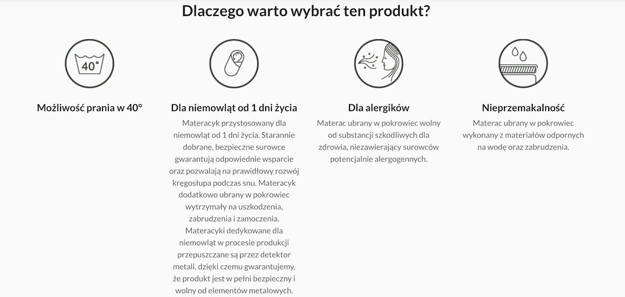 • Produkty należy chronić przed kontaktem z płynami, temperaturami powyżej 50°C i otwartym ogniem. Produkty mogą charakteryzować się specyficznym zapachem komponentów użytych do ich produkcji, szczególnie intensywnym w początkowym okresie użytkowania. Specyficzny zapach nie oznacza, że produkt jest szkodliwy dla zdrowia.W trakcie użytkowania materaca na jego powierzchni mogą wystąpić trwałe odkształcenia sięgające nawet 15% wysokości materaca, co jest całkowicie naturalną konsekwencją użytkowania materaca.