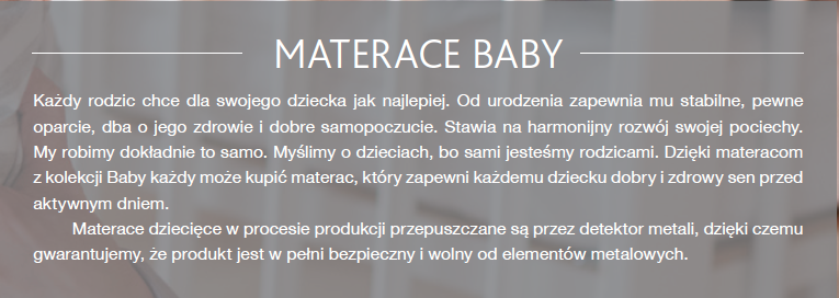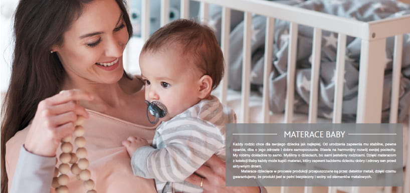 Każdy rodzic chce dla swojego dziecka jak najlepiej. Od urodzenia zapewnia mu stabilne, pewne oparcie, dba o jego zdrowie i dobre samopoczucie. Stawia na harmonijny rozwój swojej pociechy.My robimy dokładnie to samo. Myślimy o dzieciach, bo sami jesteśmy rodzicami. Dzięki materacom z kolekcji Baby każdy może kupić materac, który zapewni każdemu dziecku dobry i zdrowy sen przed aktywnym dniem.Materace dziecięce w procesie produkcji przepuszczane są przez detektor metali, dzięki czemu gwarantujemy, że produkt jest w pełni bezpieczny i wolny od elementów metalowych.