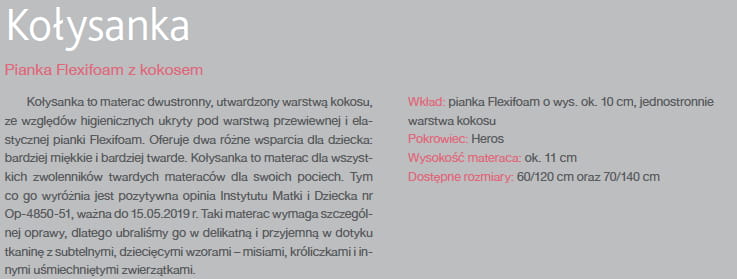 Kołysanka to dwustronny, nieprzemakalny materac dla niemowląt od pierwszych dni życia. Wkład na bazie przewiewnej i elastycznej pianki Flexifoam utwardzono warstwą kokosu z dodatkiem lateksu, zabezpieczając tym samym materac przed wilgocią i przemoczeniem. Konstrukcja materaca oferuje wybór bardziej miękkiego lub bardziej twardego wsparcia – wystarczy odwrócić materac na drugą stronę.