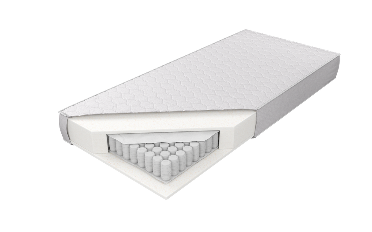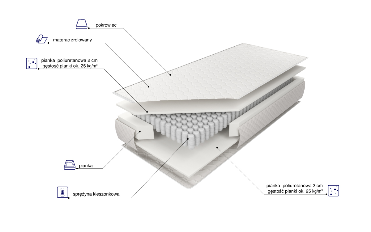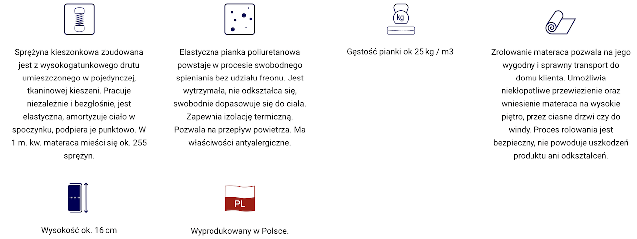 o wysokości ok. 18 cm (w zależności od pokrowca) zbudowany ze sprężyn kieszonkowych z wysokogatunkowego drutu, umieszczonych w pojedynczych kieszeniach o średnicy 58 mm, klejonych warstwowo fliseliną od góry i dołu, zwiększających elastyczność oraz punktowe podparcie dla kręgosłupa. Z obu stron zastosowana została 2 cm warstwa wytrzymałej, nie odkształcającej się pianki poliuretanowej. Materac jest zrolowany. Umożliwia to na jego wygodny i sprawny transport do domu klienta. Proces rolowania jest bezpieczny, nie powoduje uszkodzeń produktu ani odkształceń.
