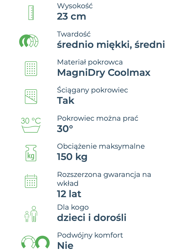 - jest odpowiedni dla dorastających dzieci oraz dorosłych, którzy wolą sztywniejszy materac; niweluje negatywne efekty skoliozy kręgosłupa i zaburzeń biomechanicznych