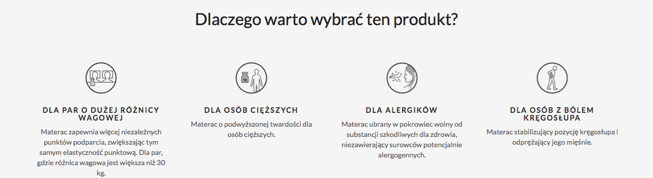 • Produkty należy chronić przed kontaktem z płynami, temperaturami powyżej 50°C i otwartym ogniem. Produkty mogą charakteryzować się specyficznym zapachem komponentów użytych do ich produkcji, szczególnie intensywnym w początkowym okresie użytkowania. Specyficzny zapach nie oznacza, że produkt jest szkodliwy dla zdrowia.W trakcie użytkowania materaca na jego powierzchni mogą wystąpić trwałe odkształcenia sięgające nawet 15% wysokości materaca, co jest całkowicie naturalną konsekwencją użytkowania materaca.